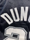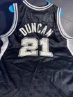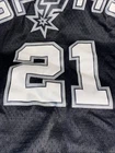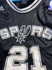 This is a vintage Tim Duncan Adidas Swingman Jersey for the San Antonio Spurs in size XL+2. It is an officially licensed NBA product, featuring Duncan's #21. The jersey is black in color and is designed for unisex adults. It is made in Honduras and is perfect for basketball fans looking to represent the San Antonio Spurs and Tim Duncan.