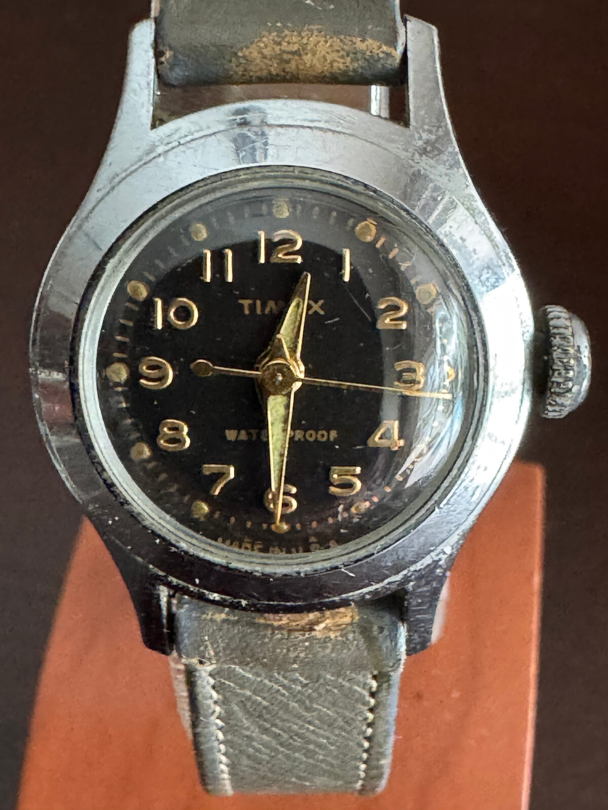 VINTAGE BOYS 27MM TIMEX US TIME WRIST WATCH KEEPING TIME NICE BLACK & GOLD DIAL