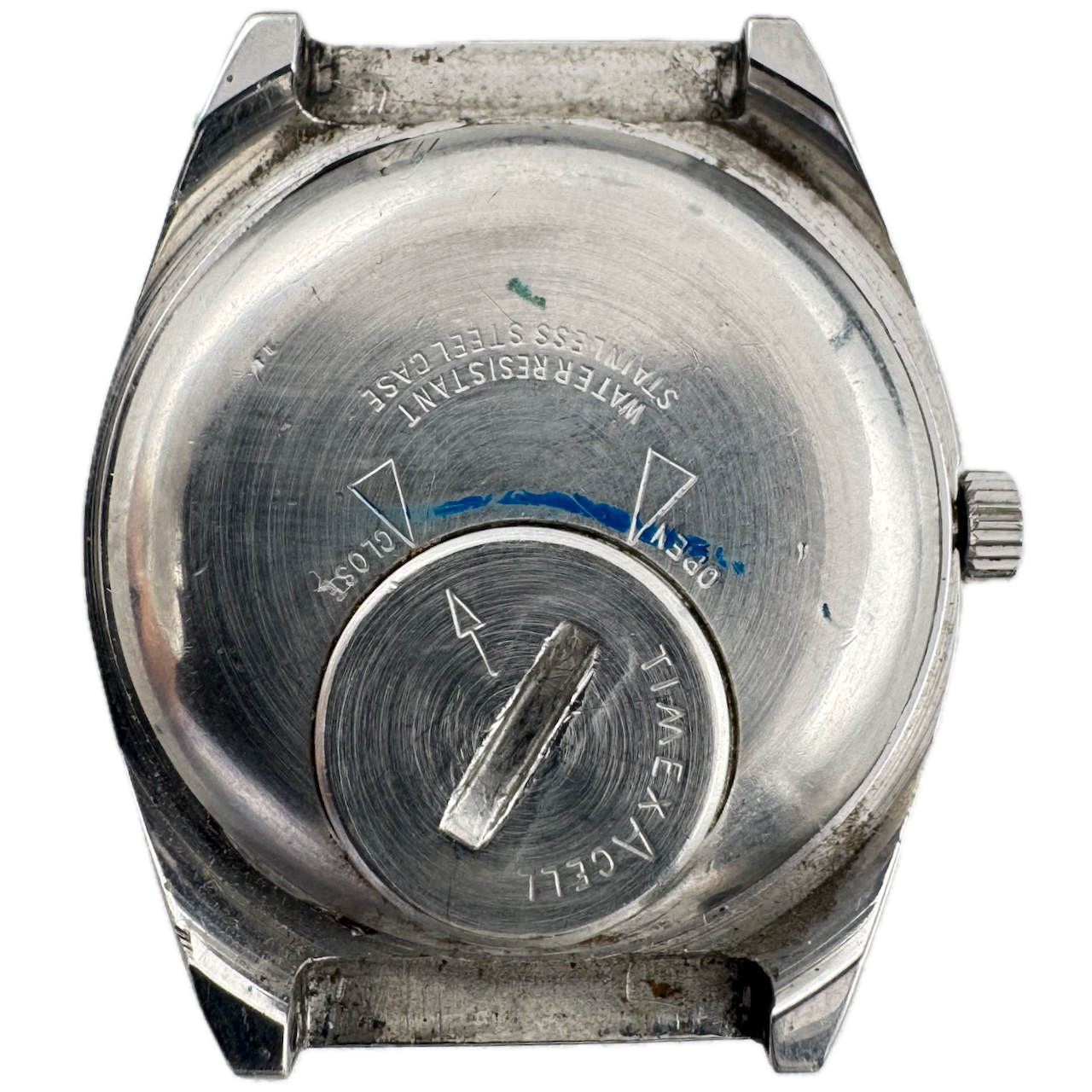 Vintage Timex Wavy Blue Day Date Two Tone Men's Quartz Wristwatch Taiwan Steel Product Description Item: Wristwatch Brand: Timex Model: Wavy Blue Day Date Two Tone Movement: Quartz Case Material: Steel Country: Taiwan Gender: Men's Size: 38.5mm Product Measurements Diameter: 38.5mm Width: TRUEmm Lug Width: 19.5mm Lug to Lug: 44mm Thickness: 15 mm Product Condition Overall Condition: Poor, overall condition for its age. Functions: Not running, has been tested and is not running. Case: There are scratches on the case. Crystal: There are scratches on the crystal. Dial: The dial has scratches on it. Hands: There is discoloration on the hands.
