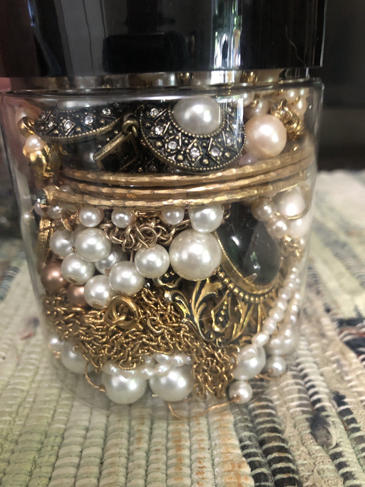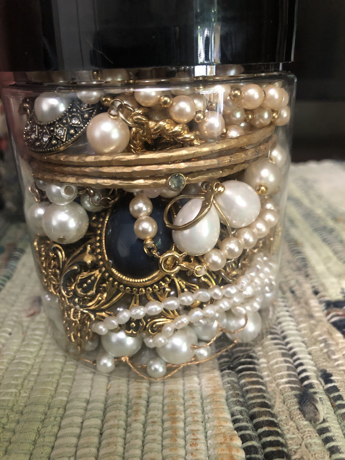 This Vintage To Now Genuine and faux Pearl And Mostly Gold Mystery Jewelry Jar is a mixed lot of earrings, necklaces, bracelets, and rings, all featuring pearls as the main stone. The jewelry pieces are from various eras, with a vintage touch, and are made with mixed metals and materials. This unisex adults' collection offers a unique and diverse selection of fashion jewelry for those who appreciate a blend of classic and modern styles. I NEVER knowingly use Temu,Shein or affiliated vendors in any of my jars.
