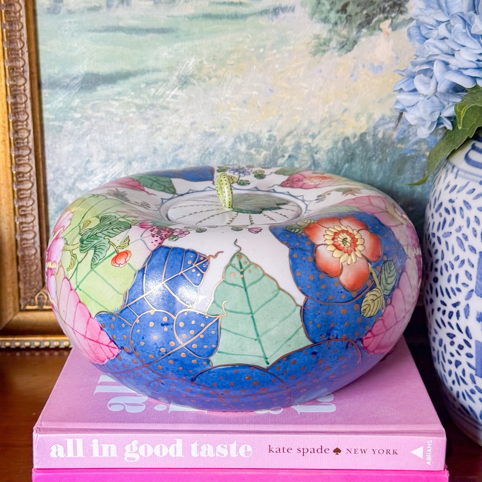 Fantastic rare tobacco leaf porcelain pumpkin jar. Perfect addition to your Thanksgiving decor or to any tobacco leaf collection! I just love the little stem handle. 30” circumference at widest. Andrea by Sadek sticker on bottom. In great vintage condition. Tiny flaw on the under side of the lid. Paint is still vibrant. Weighs a little over 4lbs Please note items may appear slightly different in color based on lighting in your own home. I use natural light and a light box to photograph my items. Also, with vintage items, slight imperfections or normal wear with age is to be expected. I strive to disclose and show any flaws. Photos are by far the best representation of the item. Smoke free pet free home. Same to next business day shipper. Always packed with the utmost care. I do use recycled shipping boxes to be kinder to the planet. If that is an issue please don't hesitate to reach out.