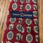 This vintage Tommy Hilfiger men's silk tie features a classic design with crests and medallions, perfect for a preppy look. Made in the United States with 100% silk satin, this multicolor tie exudes sophistication and timeless style. This necktie is a piece of men's accessories that adds a touch of retro charm to any outfit, making it a standout addition to any wardrobe.