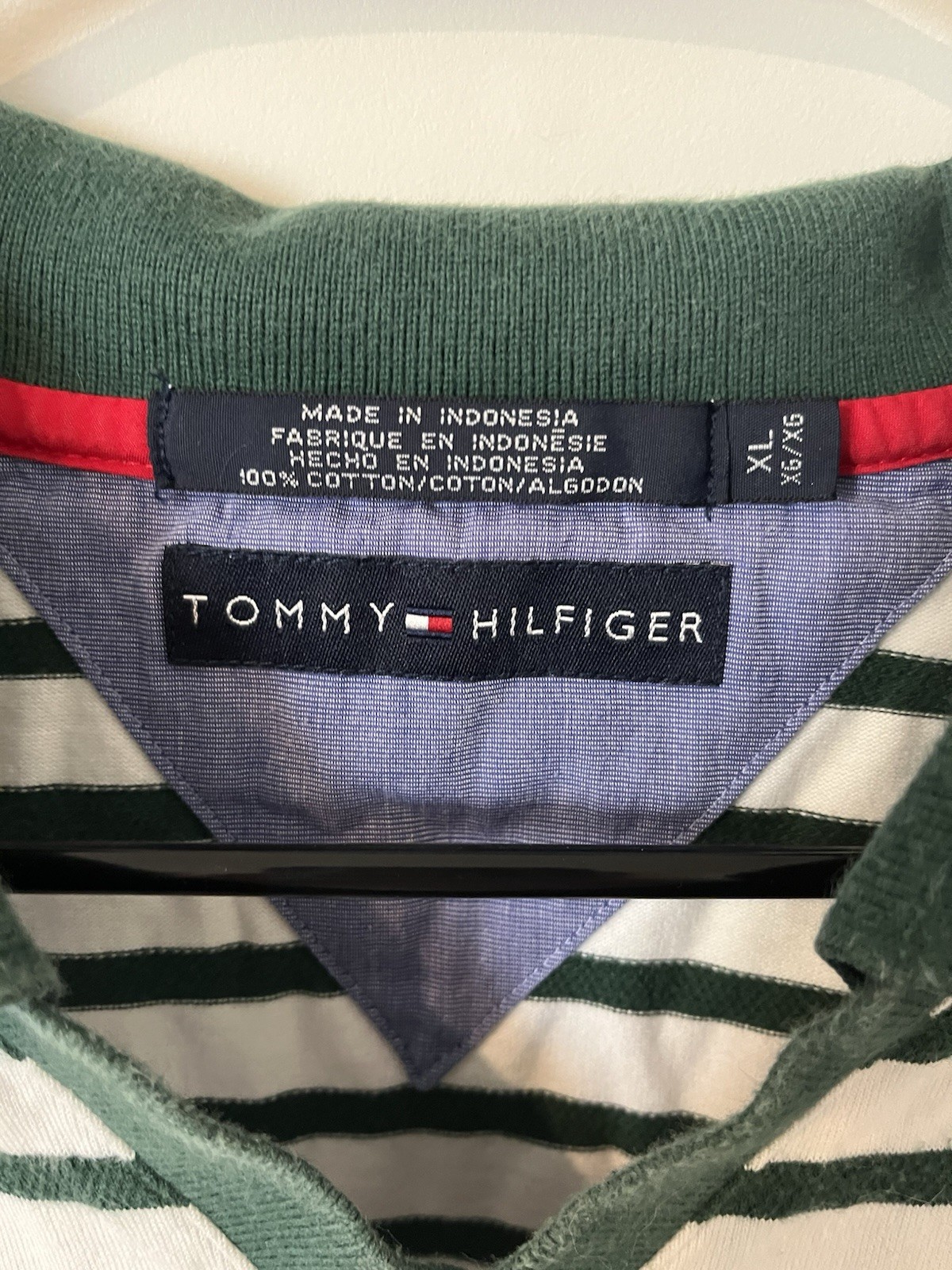 Elevate your casual wardrobe with the classic style of a vintage Tommy Hilfiger men's polo shirt. This time-honored piece features a crisp white and green striped pattern, short sleeves, and a traditional collared neckline with a three-button closure that adds a touch of sophistication. Crafted from 100% cotton, this polo shirt ensures breathable comfort and easy care, making it a versatile addition to your wardrobe for all seasons. The shirt comes in a size XL with a regular fit that's perfect for a relaxed yet polished look. Embroidered with the iconic Tommy Hilfiger logo, it’s a subtle nod to the brand’s premium quality. Whether you're hitting the golf course or enjoying a casual day out, this polo shirt is designed to meet the needs of both performance and style.