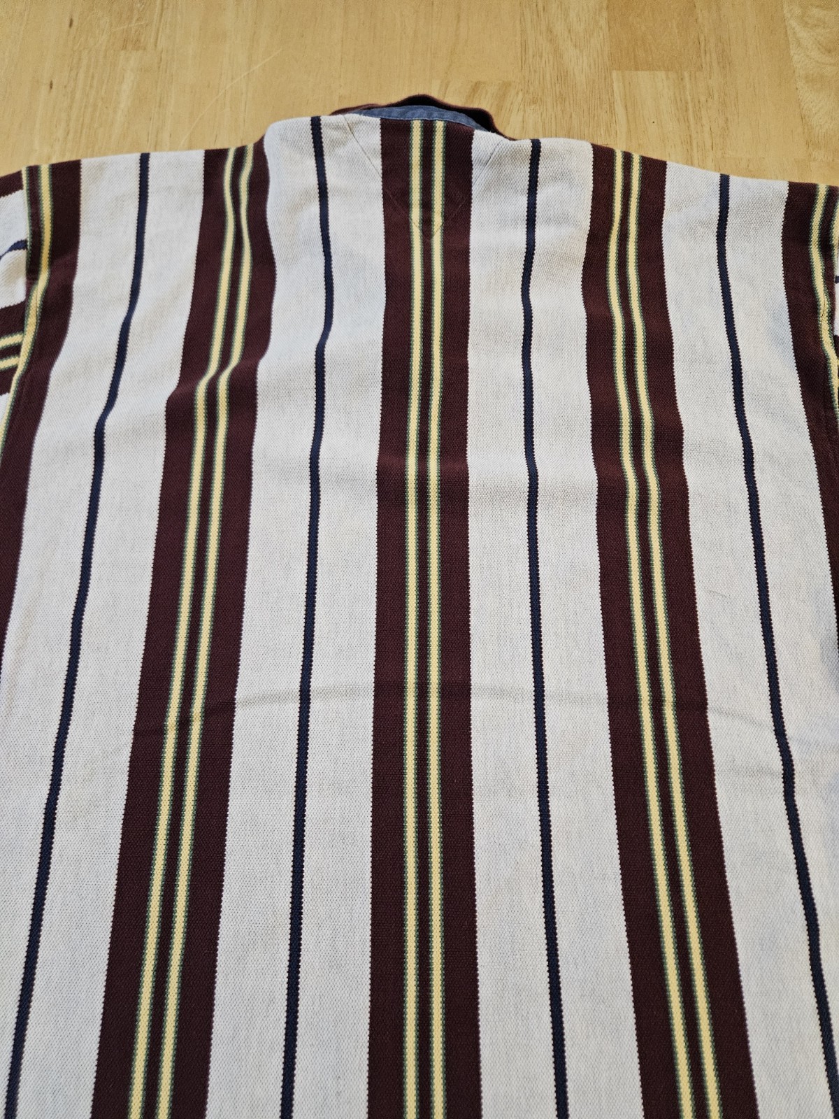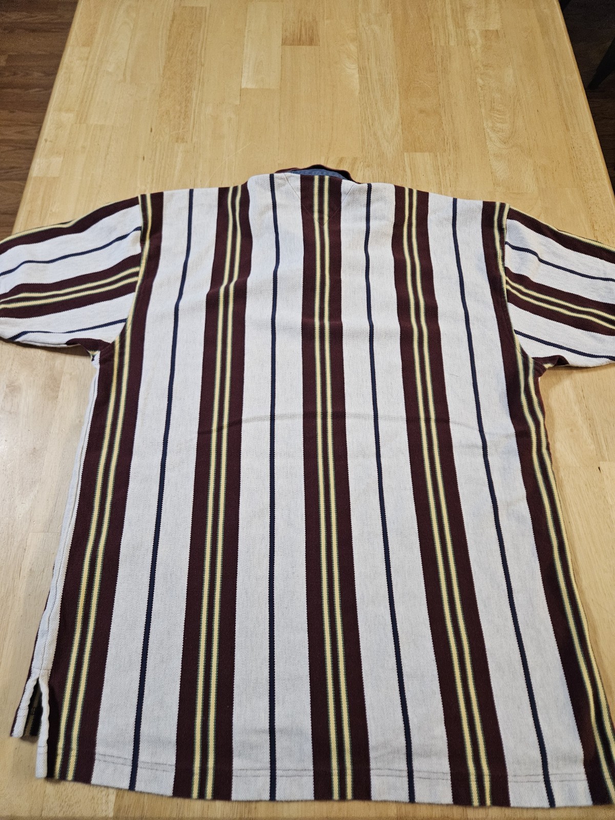 This Vintage Tommy Hilfiger Striped Polo Shirt is a classic addition to any man's wardrobe. With its timeless brown color and comfortable short sleeves, it is perfect for casual outings or everyday wear. Made with quality and style in mind, this polo shirt is sure to be a staple in any man's closet for years to come.