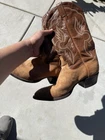 These vintage Tony Lama leather cowboy boots are a true gem for any western enthusiast. The dark brown and tan color combination, along with the men's size 9 fit, make them a perfect addition to any cowboy's wardrobe. The boots' outsole and upper material are both made of high-quality leather, ensuring both durability and style. The boots' brand, department, type, and model are all Tony Lama, men's, boots, and 1980s respectively. Their style is western, with a cowboy theme, and they were manufactured in the United States. These boots are perfect for anyone looking to add a touch of vintage style to their wardrobe.