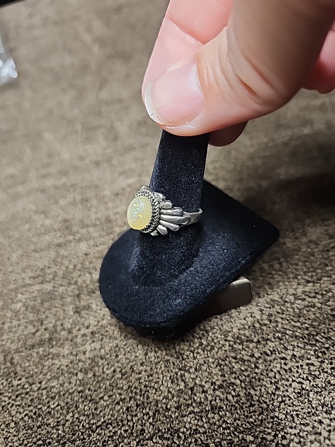 This Vintage Tribal Silver Tone Ring with Faux Opal in size 6 is a unique and stylish piece of jewelry perfect for special occasions like anniversaries and birthdays. The silver color and multicolor opal main stone add a touch of elegance to any outfit. This original vintage ring features an oval-shaped opal set in a tribal style setting, making it a one-of-a-kind accessory for women looking to add a vintage flair to their collection.