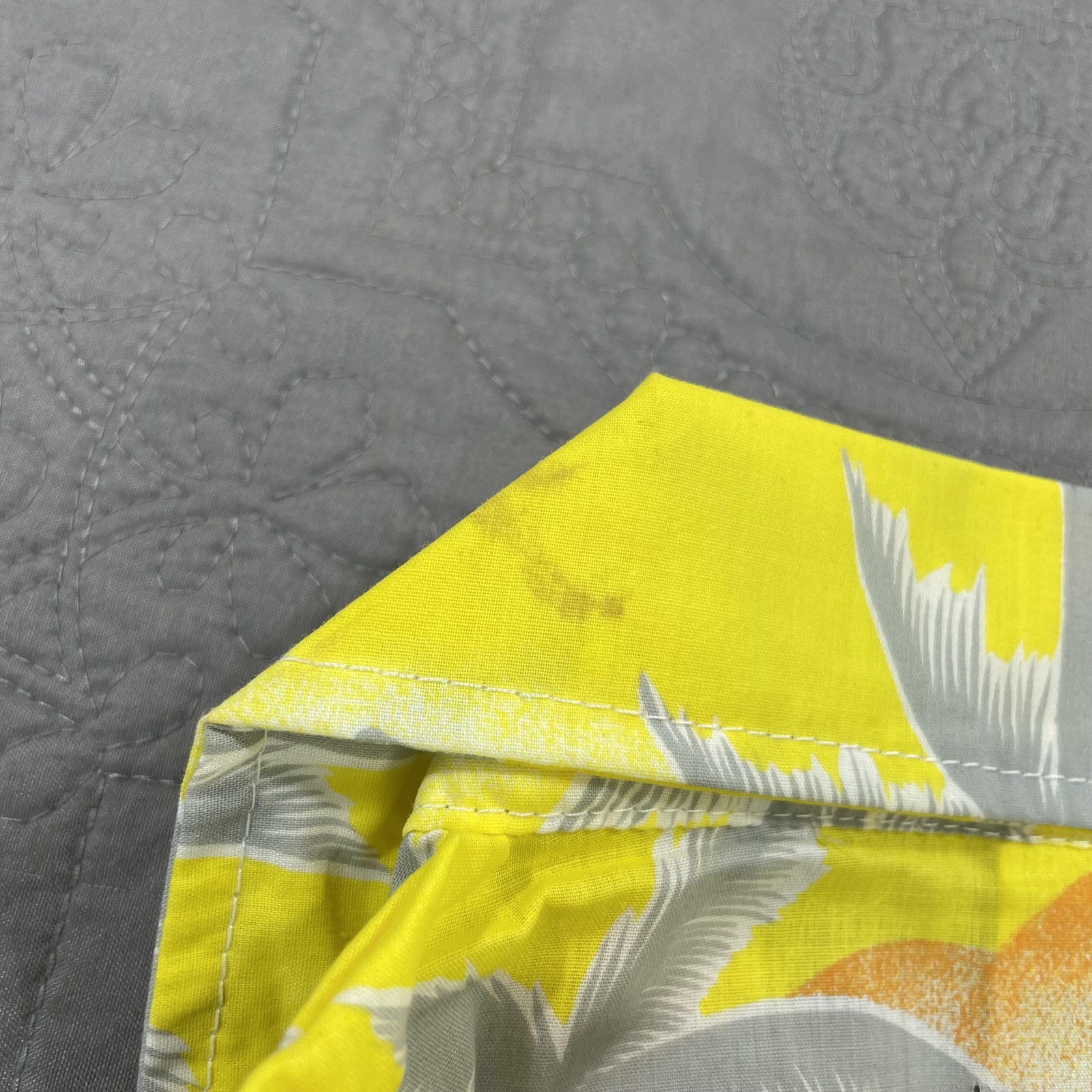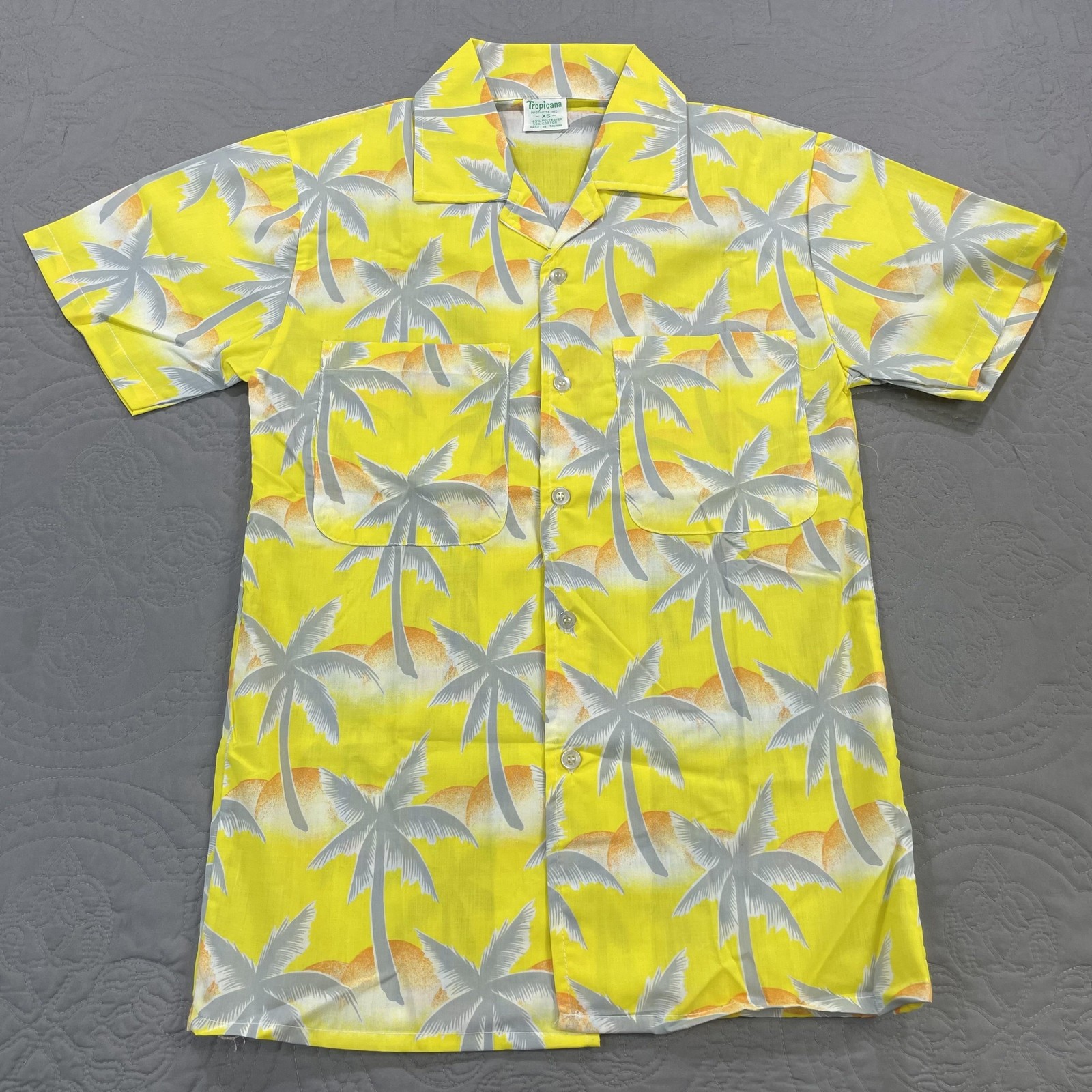 Vintage Tropicana Shirt Mens XS Yellow Palm Tree Hawaiian Button Up Beach 80s Condition: Good vintage condition with some minor flaws. There is a small faint stain on the left sleeve, shown in photos. Classic tropical and beach-themed print featuring palm trees and sunsets in yellow, gray, and orange tones. Material: 65% polyester, 35% cotton for lightweight summer comfort Button front closure with open camp collar Double chest pockets Brand: Tropicana Products Inc. Tag size: XS (Extra Small men's fit) Made in Taiwan Approximate measurements (shown in photos): Pit to pit: about 18.5 inches, length: about 27 inches Great vintage short sleeve shirt for summer, vacation, or retro 80s style! Please review all pictures for details and reach out with any questions before purchase.