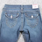 Step into the 2000s with these vintage True Religion Brand Jeans in the iconic "Billy" straight leg style. Made in the USA from imported fabric, these Y2K-era jeans feature heavy contrast stitching, button-flap back pockets, and the signature Buddha "World Tour" patch. Classic medium wash with subtle fading throughout and reinforced hem. A staple of early 2000s denim fashion, these are a must-have for collectors and streetwear lovers alike. 📏 Measurements (taken flat): Waist: 15" (30" total) Inseam: 30" Rise: 7" Leg opening: 8" Style: Billy, straight leg Material: 99% Cotton, 1% Elastane Made in USA RN: 112790 CA: 30427 Size: Tagged 30 🔍 Condition: Gently worn with minor signs of wash and wear. No holes or stains. Slight fraying at hems (see photo). All buttons and stitching intact. 📸 Note: Color may vary slightly due to lighting.
