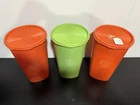 Vintage Tupperware set #1222 Two Orange and one Green Servalier Canister with #808 seal. This set includes 3 canisters in a retro style, featuring a food/kitchen theme. The canisters measures 10 1/2" in height, with dimensions of 6 1/2" in length and width. The model is Tupperware 1222, known for its original design. This vintage is in very good condition.