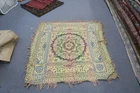 Beautiful tablecloth, throw shawl has Islamic calligraphy and scenes made of mercerized cotton measures 48" x 48" not including the fringes nice and neat - has small areas with missing fringes shown in picture 5