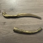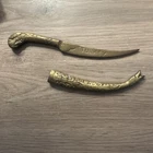 This vintage Turkish letter opener features a blade with a snake/serpent design, made of brass and marked with Turkish craftsmanship. It is a handmade item that comes with a sheath for storage.