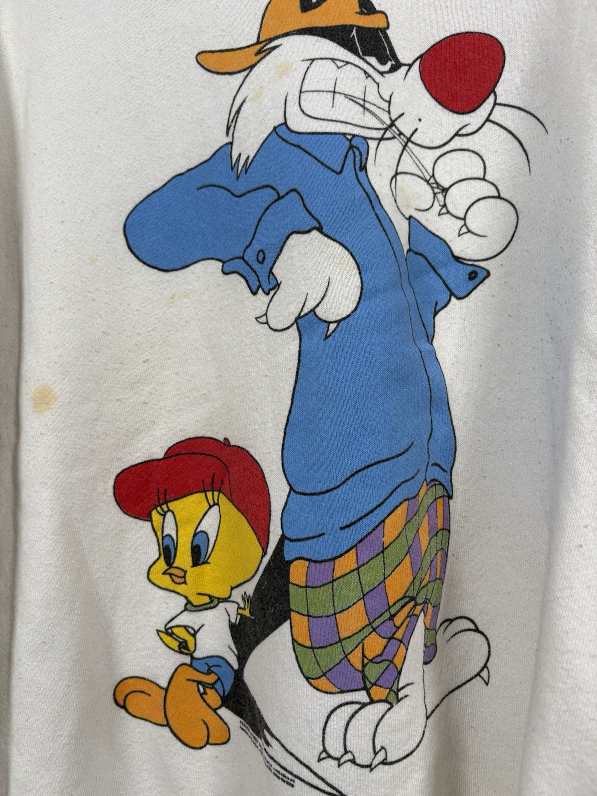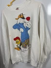 Vintage 1995 Warner Bros Looney Tunes crewneck sweatshirt featuring Sylvester in a blue jacket and Tweety in a red cap. White base, embroidered detail. Tag size XL. ✅ Official Warner Bros 1995 licensed piece ✅ Rare Sylvester & Tweety duo design ✅ XL fit, 90s hip-hop/cartoon streetwear vibes Condition: Pre-owned, some spotting noted (see photos). Rare 90s cartoon collector’s grail. ⚠️ Please note: Any returns will be subject to a 40% restocking fee.