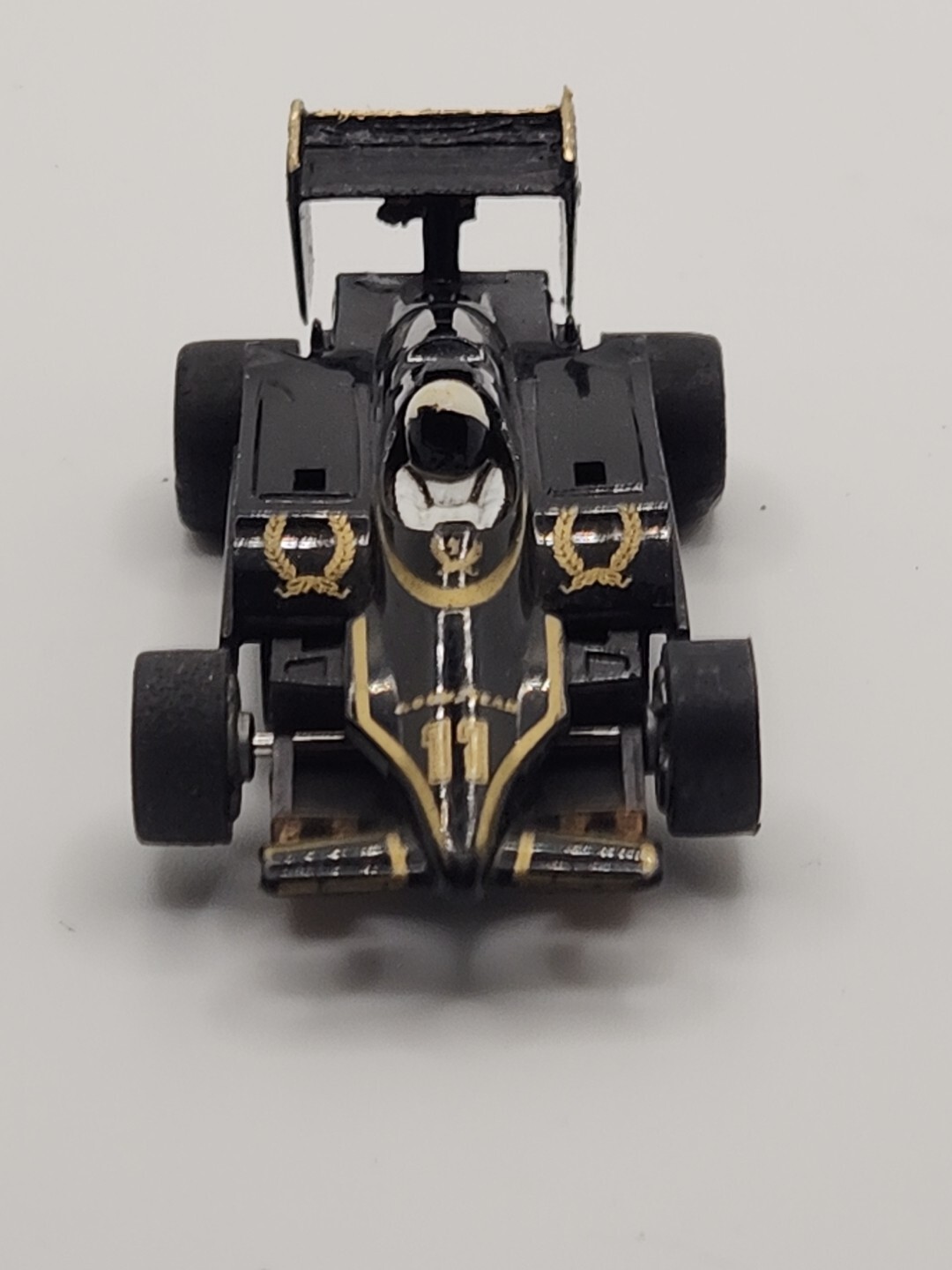 Tested with a 9 volt, motor runs great! Looks to be a different wing, but the previous collector took care of his cars, and this shows. Very cool example. Vintage Tyco #11 F1 Lotus HO slot car features a John Player black and gold livery, reflecting a classic design. Made by TYCO and designed as a car type in HO scale, this collectible piece is a nostalgic addition to any slot car collection.