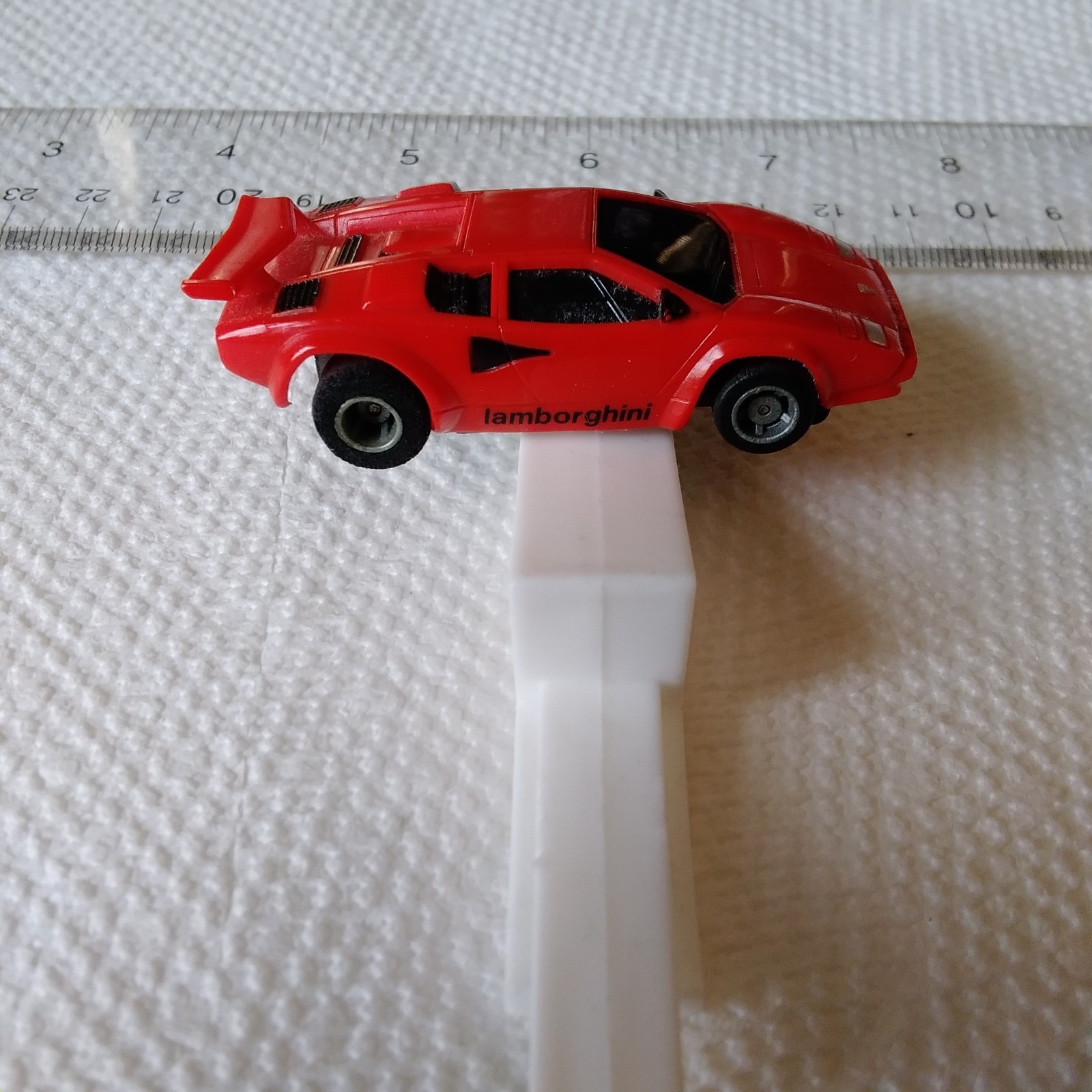 Vintage Tyco Lamborghini Countach Ho slot car, red 1988. Tested on track. Works great... Super Fast! Broken spolier (see pics). Could use a Cleaning and new tires.
