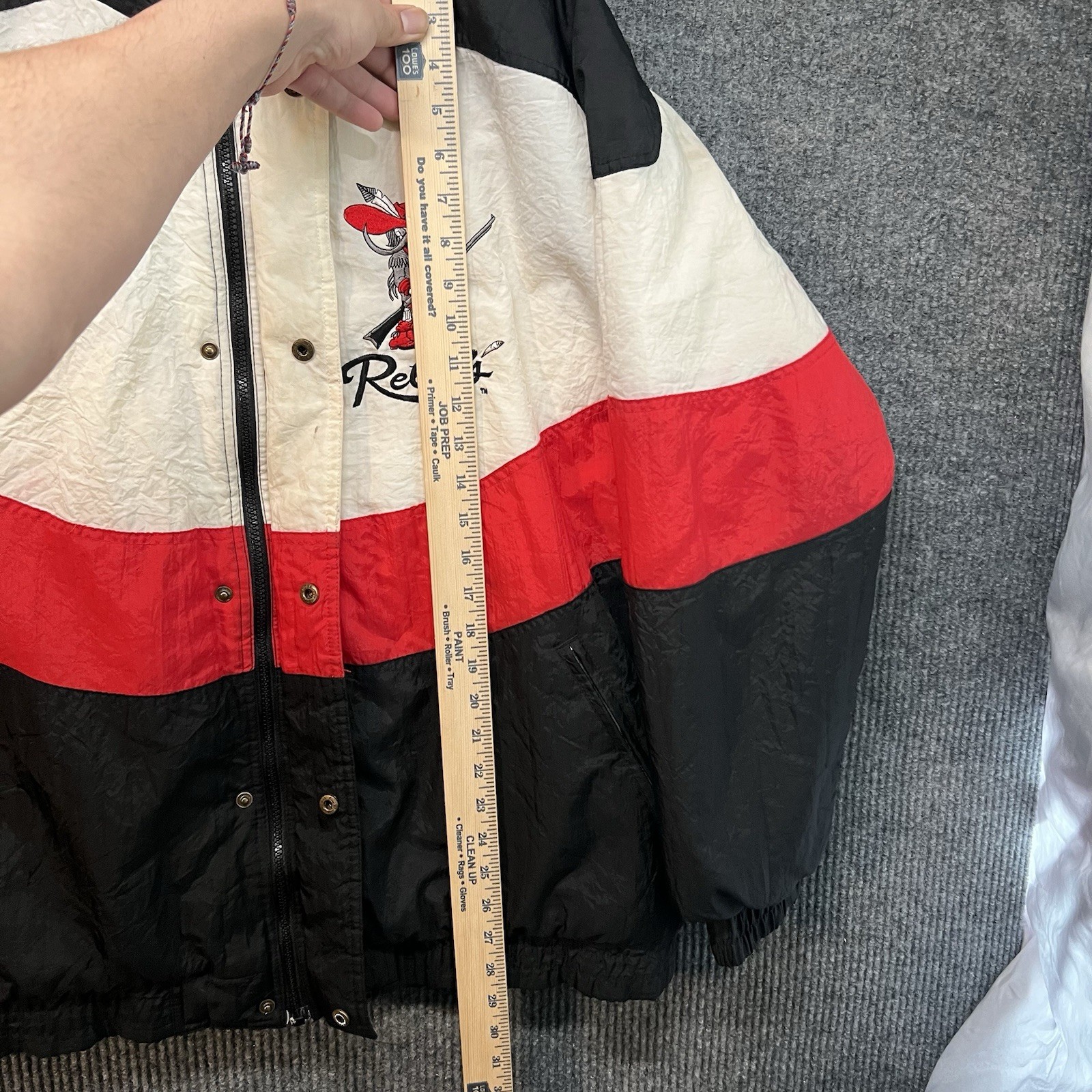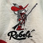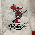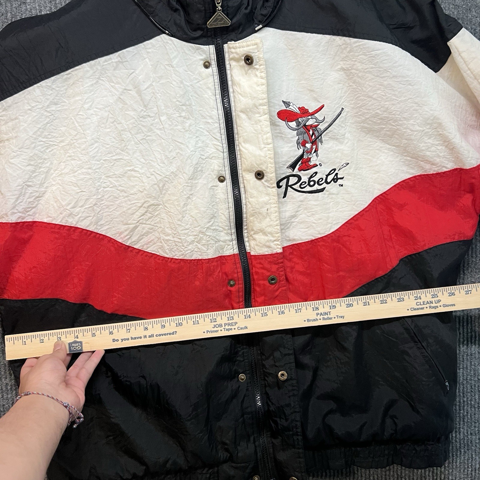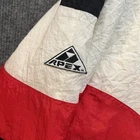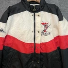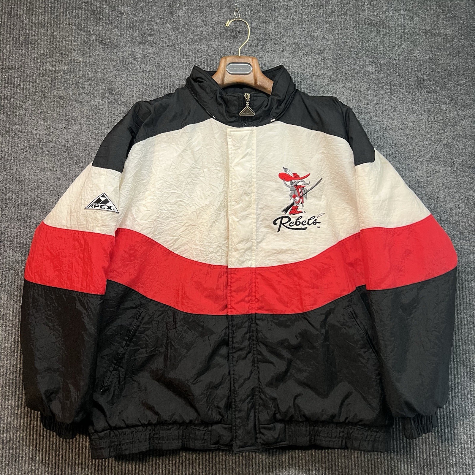 Slight yellowing on inside part of zipper cover. The Vintage UNLV Runnin Rebels Jacket by Apex One is a Men's XL black puffer jacket with red accents, featuring a full zip design. Officially licensed by UNLV, this jacket is perfect for fans of the college team. Made in Hong Kong in the 90s, this retro piece is ideal for showing support during the regular season. With its classic design and unique team logo, this jacket is a must-have for any UNLV Rebels fan looking to stay warm and stylish.