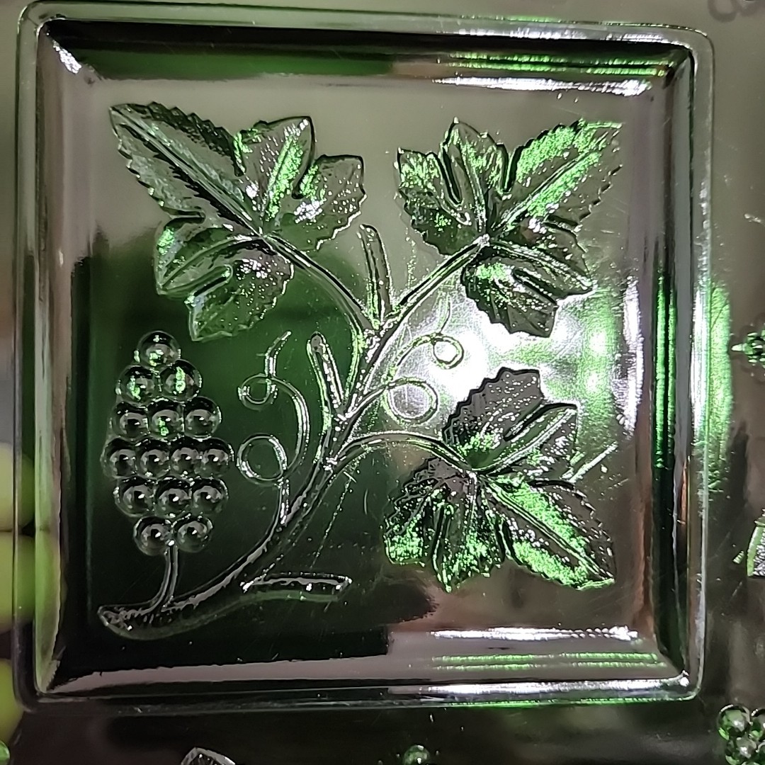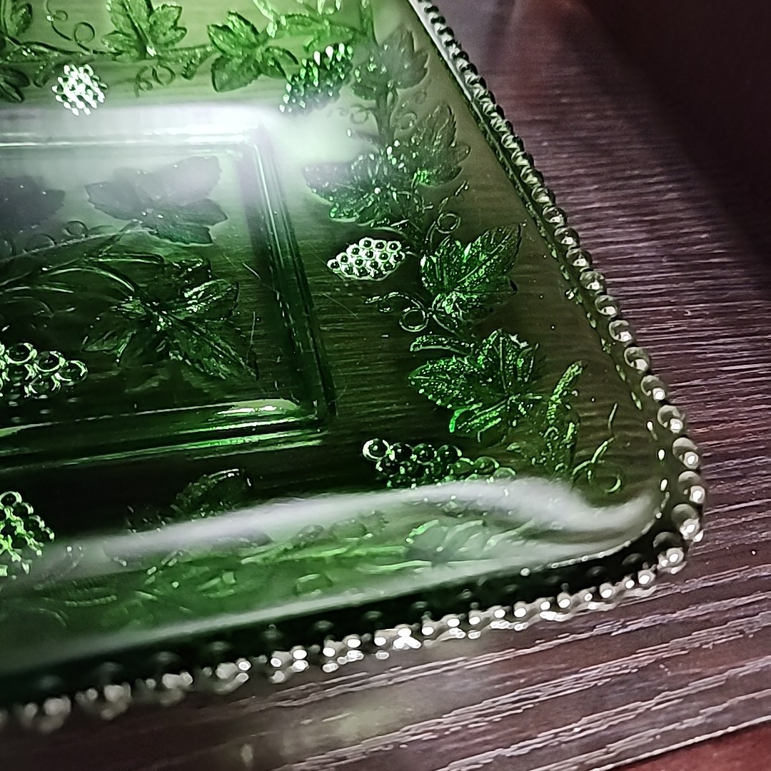 This vintage Emerald Green Square Beaded Grape Glass Bowl is a stunning piece of history from the early 1900s, crafted by the renowned US GLASS CO. The intricate berries pattern pressed glass bowl showcases the exquisite craftsmanship of the period, with a vibrant green hue that captures the eye. Measuring at 8.25 inches in width and standing 1.5 inches tall, this bowl is a testament to the artistry of California-made glassware. The square shape adds to its uniqueness, making it a noteworthy addition to any collection or as a stand-alone display piece. With a weight of 1.9 lbs, it's substantial enough to be a focal point on any surface.