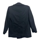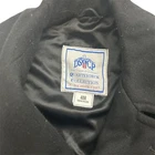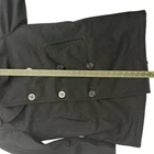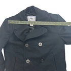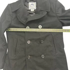 This men's pea coat is a mid-length, classic fit garment made from black wool, suitable for winter. It features a double-breasted button closure, notched lapel collar, and hand-warmer pockets. The coat has a solid pattern and a vintage military theme, making it appropriate for both casual and formal occasions. The lining is also wool, and it requires dry cleaning. The coat is pre-owned. Keywords: men's coat, pea coat, wool, black, winter coat, double-breasted, vintage, military style, formal wear, casual wear, mid-length, classic fit, notched collar, pre-owned.