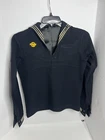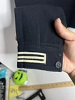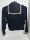 This is a vintage U.S. Navy Sailor uniform made of wool. The coat and pants are in great to excellent vintage condition and come in a size small. The uniform features blue, red, yellow, white, navy, navy blue, and multicolor colors. It is an original period item from the United States and was made during the WW II (1939-45) conflict. The uniform is perfect for collectors of militaria and those interested in the history of the U.S. Navy. Y