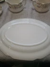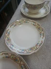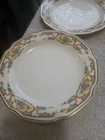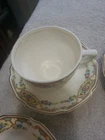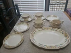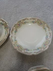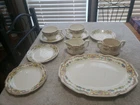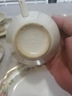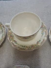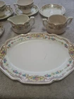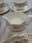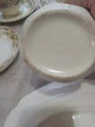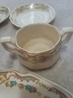 This vintage USA dinner service set includes 10 pieces made of ceramic material. The set has a charming pattern and is perfect for your next dinner party or gathering. Please note that the creamer has a small chip. The brand of this dinner service set is from the USA and it is a mix lot of decorative cookware, dinnerware, and serveware. The set is perfect for collectors or those who appreciate vintage items. The set includes plates and a creamer, but please be aware of the small chip.