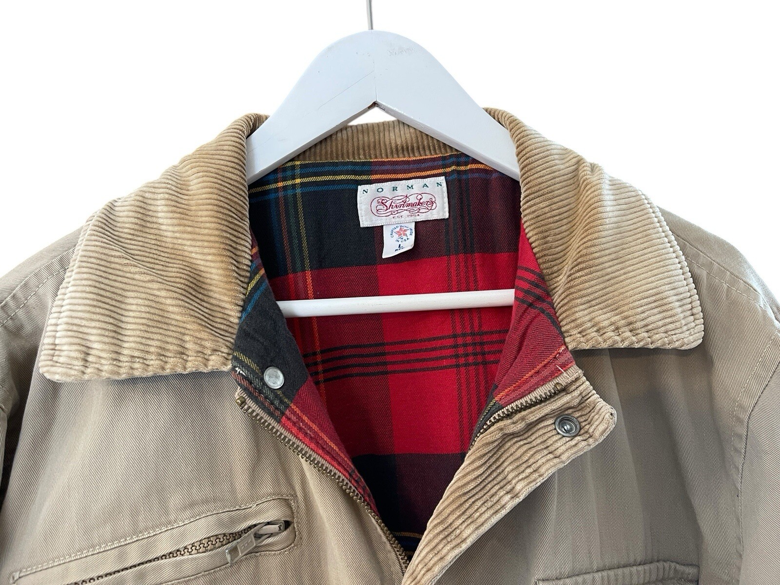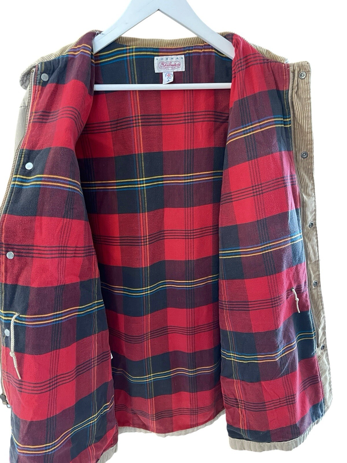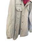 In excellent condition Cotton canvas exterior Cotton flannel lined Corduroy collar and trim Zip and snap closure Zippered chest pocket Snap pockets Reinforced elbow patches 25" pit to pit 33" total length
