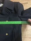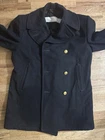 Vintage USMS Merchant Marine Pea Coat 40R – Black Wool, Brass Buttons, 1980s-90s Original U.S. Merchant Marine Service pea coat, size 40R, made of heavy black wool. Features authentic brass USMS buttons (3 present out of original 6). Double-breasted style. Estimated production late 1980s–1990s (NSN 8405-01-154-5789). Condition: Used. Lining has separated at underarm seams (see photos). Missing 3 original brass buttons. Still a collectible piece, rarer than standard US Navy pea coats. Great for collectors, restoration, or display.