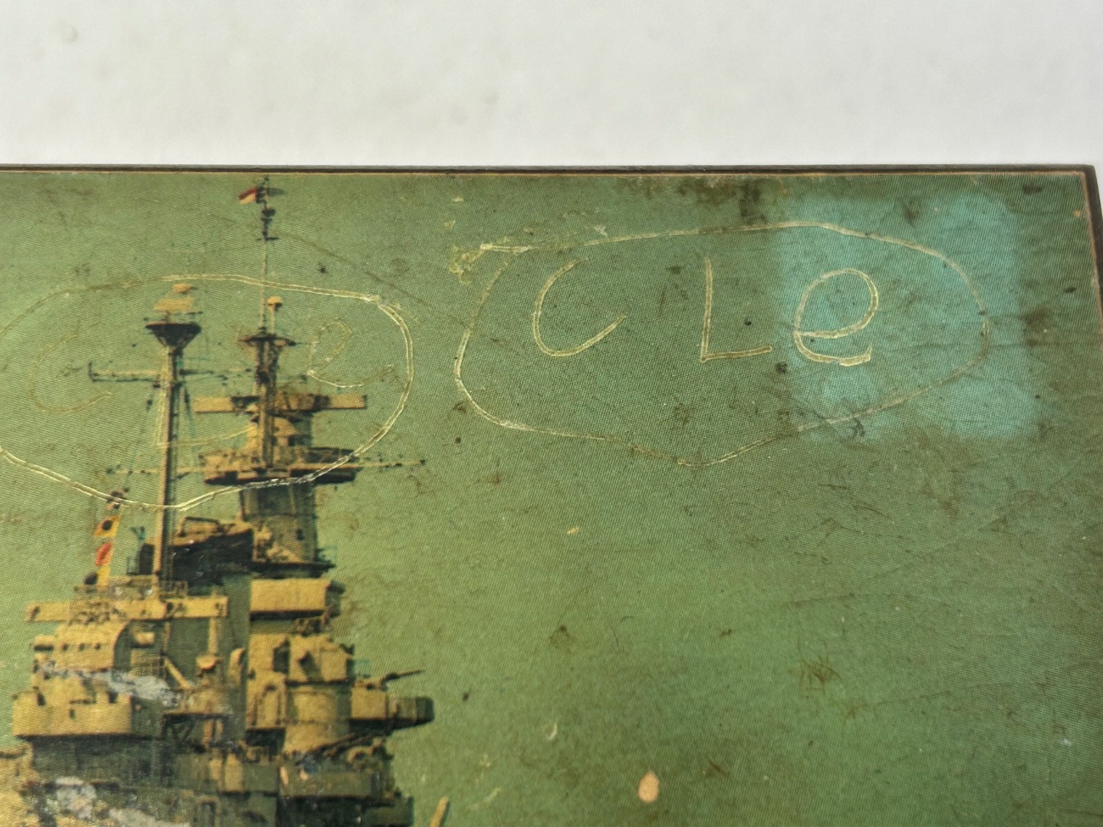 Vintage USS North Carolina Battleship Memorial Small Cedar Box. It measures 3.5 x 5.5 x 2.5 inches, the box has scratches and scuffs and letters scribbled on it.