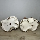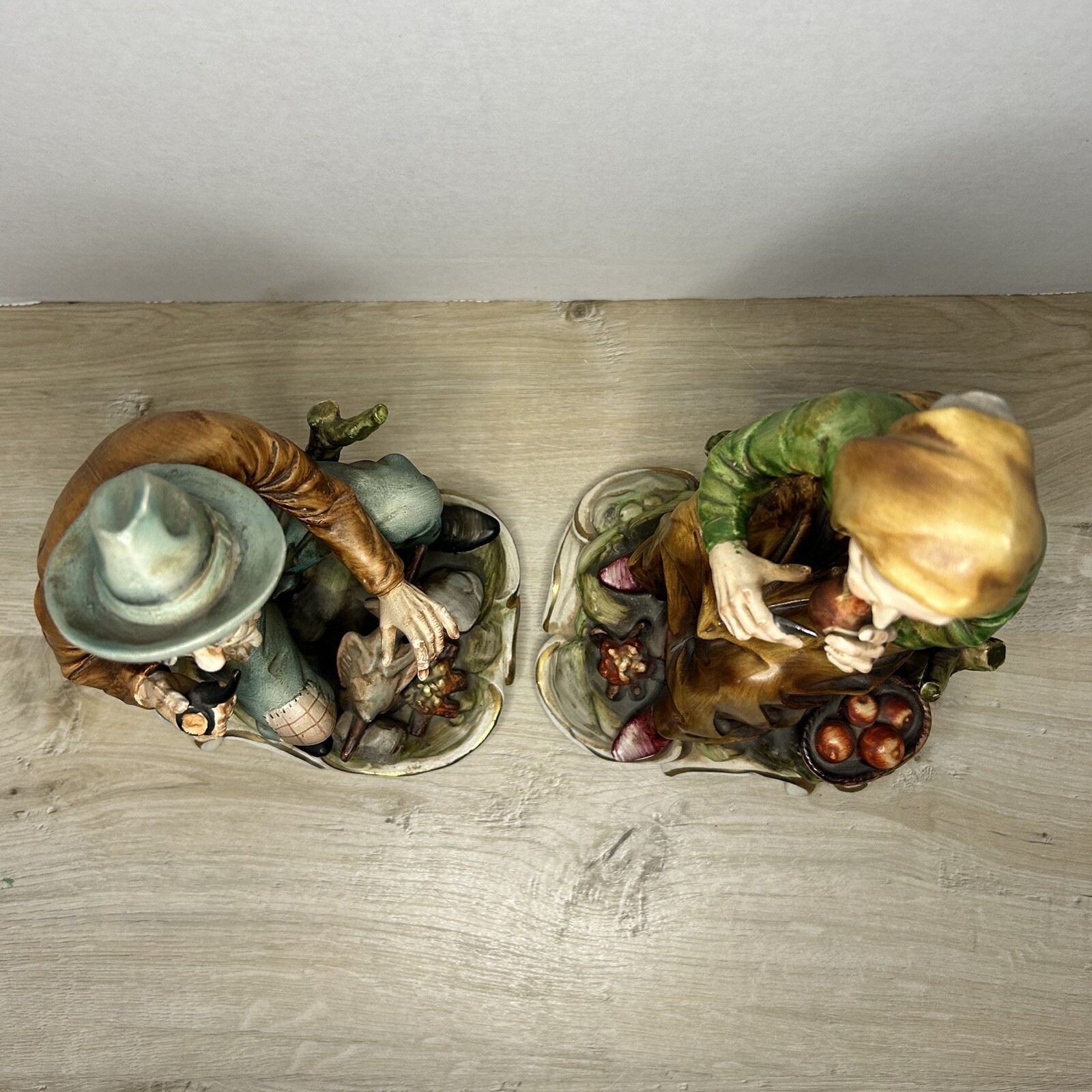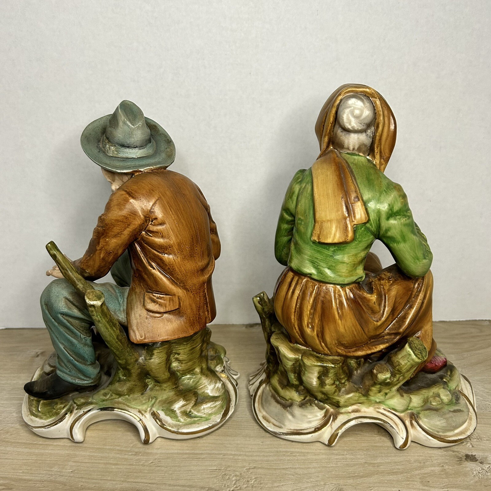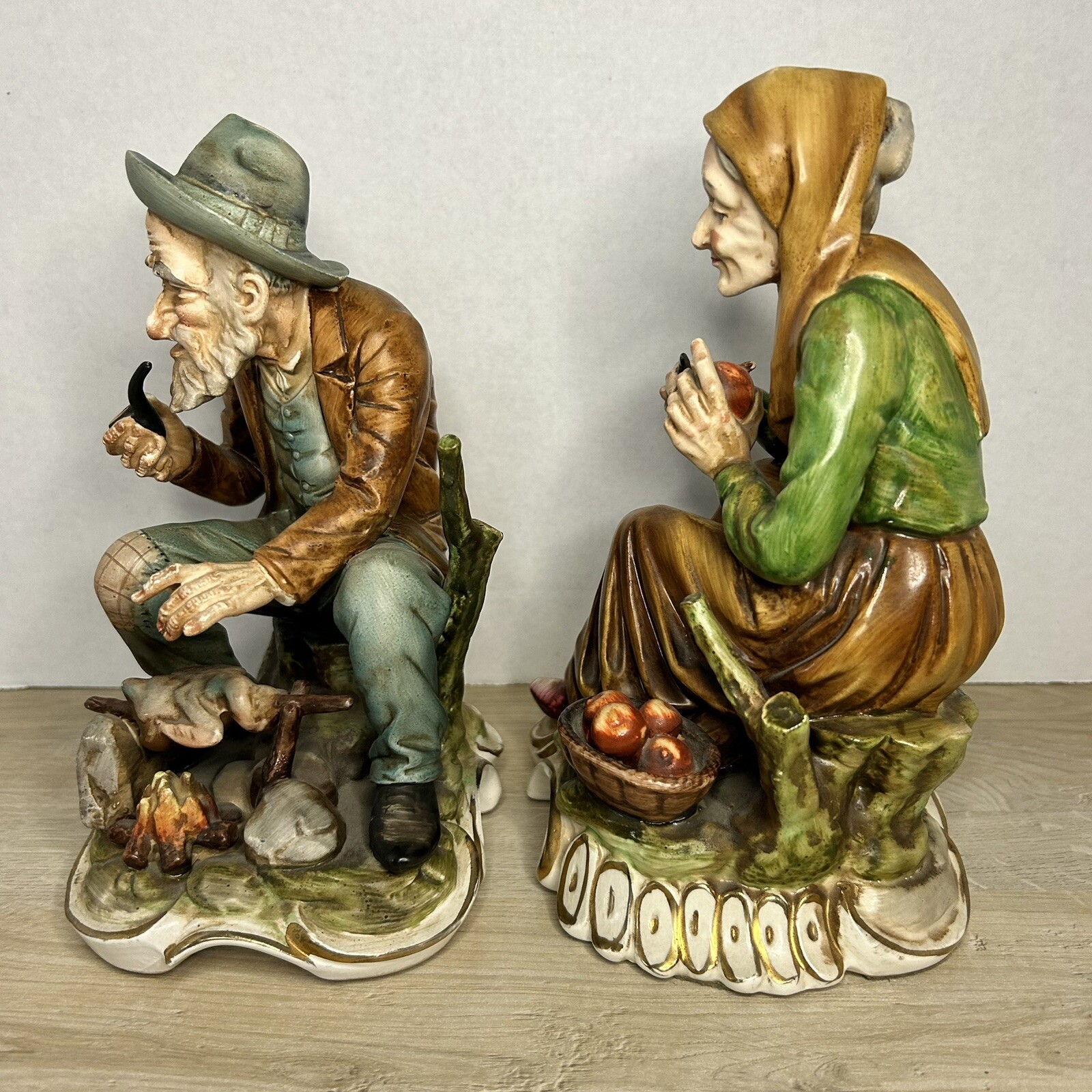 Vintage set of 2 Ucagco Japan figurines. Man smoking pipe, roasting bird over fire measures 8” tall x 5.5” x 4.25”. Woman peeling apples over fire measures 8.5” tall x 6” x 4.5”. Both in great condition with no chips or cracks.