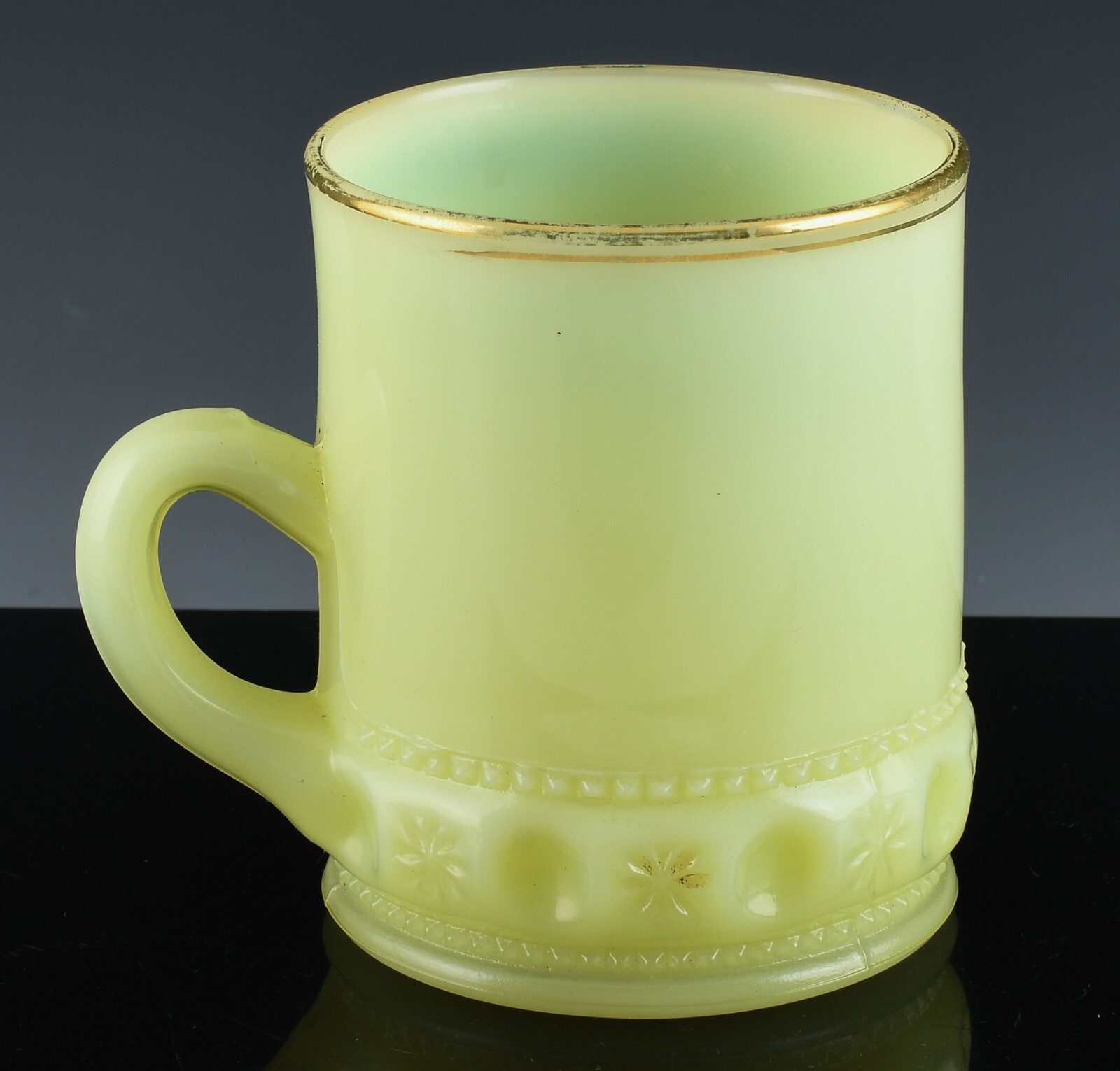 Note To all Buyers. Shipping is usually done within 1 Full Business Day Of Payment. All shipping is provided a tracking number, and regardless of location arrives usually between 2-7 Business days, please ignore the estimated time Ebay displays for you. DESCRIPTION : Here we are offering Uranium glass mug, up for sale and your consideration. Made from fine Vaseline glass containing traces of Uranium, which makes the piece admit a bright Zombie green like glow when under the effects of a UV Black Light. This piece is in the very collectible custard glass and has such a strong glow. The merry Christmas is in a fine gold and the embossed base is eye catching. Very cool, perfect for a nice Collection or would make the most outstanding gift to someone dear to you! The last photo is a small sample of the Uranium glass we have to offer, please check out our Page, and save greatly with combined shipping! CONDITION : In Vintage Estate Fresh condition, with no chips, cracks, or repairs. Only some minor scuffs and wear consistent with age. MEASUREMENTS : The Mug measures approx. 3-1/4 inches tall by 2-1/2 inches wide across the top. SHIPPING : We offer combined shipping on orders, therefor the more you order the cheaper the shipping!! We also offer Worldwide Shipping on the vast majority of our stock, please contact us to arrange your worldwide and specific shipping needs!