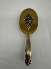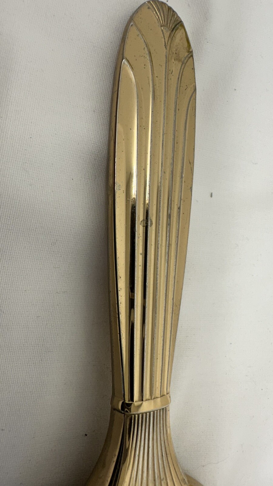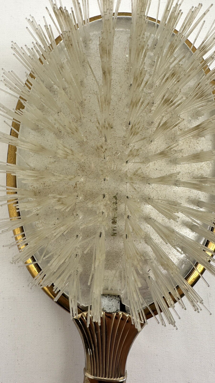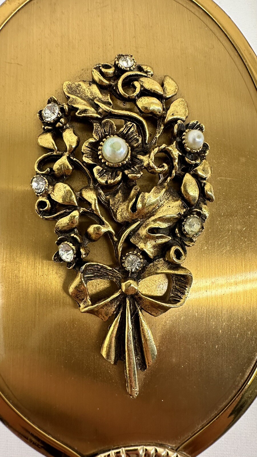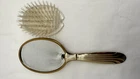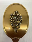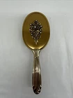 This is a vintage hair brush with a goldtone metal filigree design and colorful faux gemstones and pearls. It was made in the United States and is not handmade or modified. The brush is a collectible item and falls under the category of vanity, perfume, and shaving accessories.