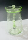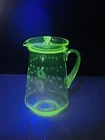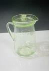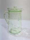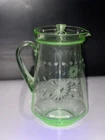 Vintage Uranium Vaseline Glass Etched Floral Lidded Water Pitcher, The pitcher is in great condition, it measures 10'' high with a base diameter of 6'' around, it measure 7 3/4'' from spout to handle. The lid does have a couple flea bites on the inside beveled rim.