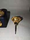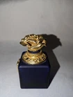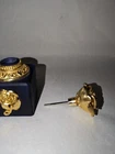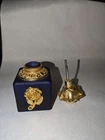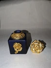 This vintage Versace perfume bottle is a stunning addition to any collection. The bottle features a gold tone design with vibrant cobalt blue decorative glass, adding a touch of elegance to any room. Made in Italy and crafted with care, this Murano glass bottle is perfect for any perfume lover or collector. With its unique design and high-quality craftsmanship, this bottle is sure to impress.