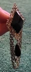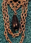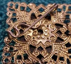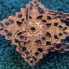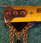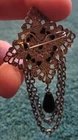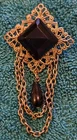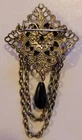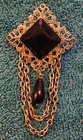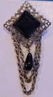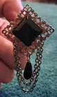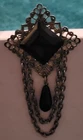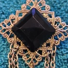 This vintage Victorian brooch / collar pin exudes a regal vibe with its gold tone finish. The square shape and faux onyx black gem add a touch of elegance to any outfit. See photos for details, condition, and measurements. Unsure of metal type or gem (feels plastic).