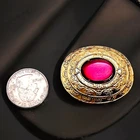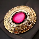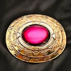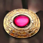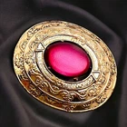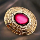 Add a touch of Victorian revival elegance to your jewelry collection with this stunning Vintage Brooch. Featuring an oval pink cabochon glass rhinestone set in a beautifully detailed gold tone frame, this brooch is a true statement piece. The intricate design and rich colors make it perfect for adding a touch of vintage charm to any outfit. The Victorian revival style, known for its romantic and elaborate designs inspired by the Victorian era, is beautifully represented in this brooch. The intricate detailing and use of cabochon glass reflect the high level of craftsmanship typical of mid-20th century jewelry, capturing the essence of the late 19th to early 20th century Victorian aesthetics. Why You Will Be Obsessed It: Timeless Elegance: The intricate gold tone design adds a sophisticated touch to any outfit. Vibrant Colors: The pink cabochon glass rhinestone provides a striking and eye-catching centerpiece. Versatile Accessory: Perfect for both formal events and adding a vintage charm to everyday outfits. Pristine Condition: Carefully preserved with all original features intact and gleaming. Comfortable Fit: Secure clasp ensures the brooch stays in place without any discomfort. Collectible Value: A must-have for vintage jewelry enthusiasts and those who appreciate high-quality, unique pieces. Please follow our store with over 2000 vintage and antique pieces just like this with new items added daily.