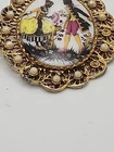 Approximately 2" brooch See photos! Fast shipping available Two courtier dance pose Its ornate gold tone casting and oval shape exude a timeless charm, making it a versatile addition to your jewelry collection. Suitable for both casual wear and formal occasions, this piece is a testament to classic style. This brooch, which can also be styled as a pendant, is a wonderful acquisition for lovers of vintage jewelry.