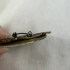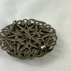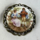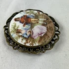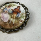 This vintage Victorian brooch pin features a beautiful pictorial design with a man reading from a book and a women playing guitar. The round shape and multicolor porcelain material create a unique and elegant look. The brooch is made with a gold tone metal and has an ornate back and border and an old clasp. This fashion jewelry piece is perfect for anyone who loves beauty, art, love, and music & dance. The brooch is pre-owned and vintage, adding to its charm and character. It measures 1.5 inches in length and does not include any stones. The country/region of manufacture is unknown. Get this stunning piece of history to add to your collection today. See photos for any wear marks.