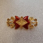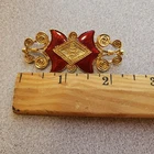 Vintage Victorian Brooch Pin Red Gold-Toned Rectangle Scroll Enamel Glaze Great condition. 2 inches long. 1 inch tall. Great traditional statement piece! Sorry, no refunds or exchanges. Please contact me with any questions PRIOR TO PURCHASE. We welcome ALL FEEDBACK and thank you for shopping with Pearl Onion! Note: Descriptions and titles of items listed by Pearl Onion are based on our own research. We are not professional appraisers and the items listed have not been professionally appraised unless otherwise indicated. Most items are used or vintage. We do our best to test for durability for wearable/useable used/vintage items (jewelry, clothing, ect) and cannot give refunds if an item breaks (including chain or fastener breakage for jewelry), rips, or tears during the course of your regular use