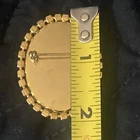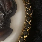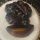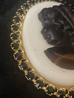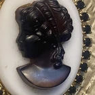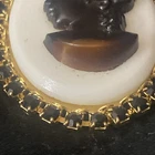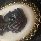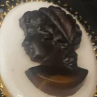 This beautiful vintage brooch features an oval cameo design with brown Cameo white backing and black faux gems .The gold tone metal setting style is flush, and the brooch measures 2 1/8" in length. The item is unmarked, and the year of manufacture is between 1970-1979. Perfect for any occasion, this brooch is a great addition to any jewelry collection. Its Victorian revival design style is beauty, art, and bohemian. The brooch is an original piece, and it is not customized. It comes from the USA, and it is not a handmade item. The seller warranty is not available, and it is not signed. Good condition- no damage ES4- dres