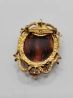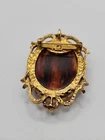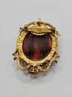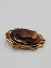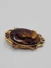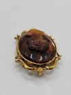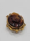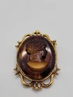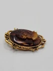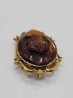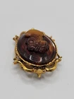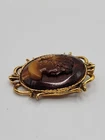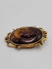 This vintage brooch features a raised cameo design in goldtone, measuring 2 inches in diameter. The brooch is a stunning piece of Victorian jewelry, perfect for any collector or lover of antique items. The brown and black tone of the brooch gives it a unique and timeless appeal, making it a great addition to any jewelry collection. The brooch is perfect for adding a touch of elegance to any outfit and is sure to make a statement wherever you go. Very good condition
