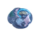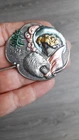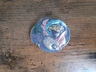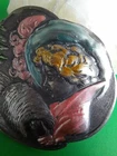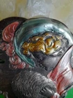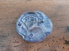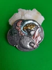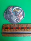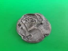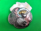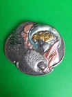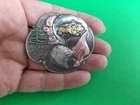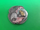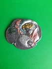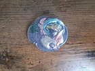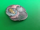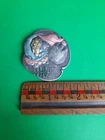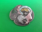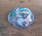 Lovely silver tone brooch depicting a Victorian woman wearing an extravagant feather hat and holding a fur muff. There is a tree in the scene behind her. Good used vintage condition with some wear due to use and age. It has been painted with what looks like an enamel paint. I do not know if this is original or if a previous owner decorated it themself. There is light wear to the paint and a misplaced bit on pink on the muff. It is unmarked and I have not tested the metal.