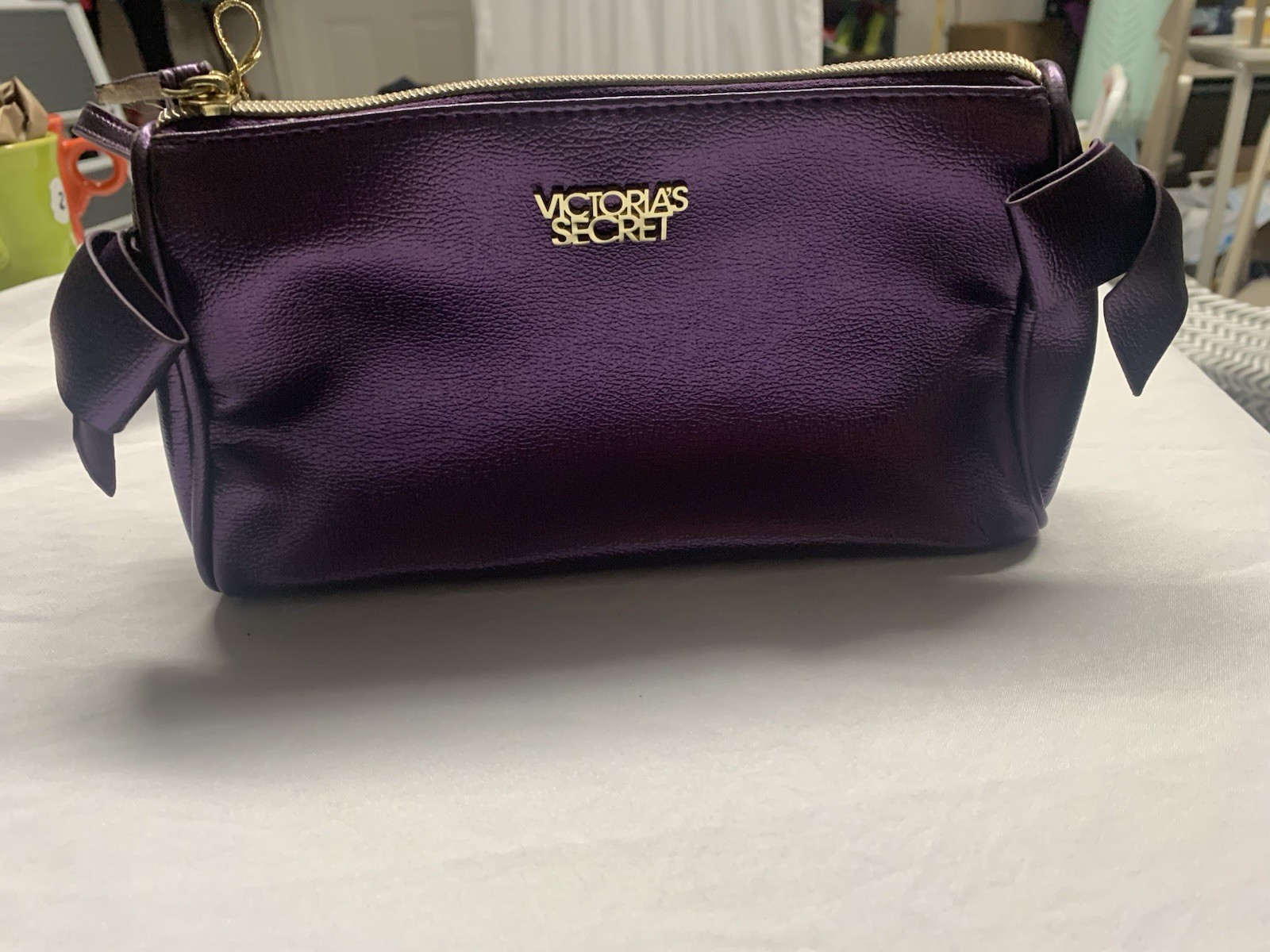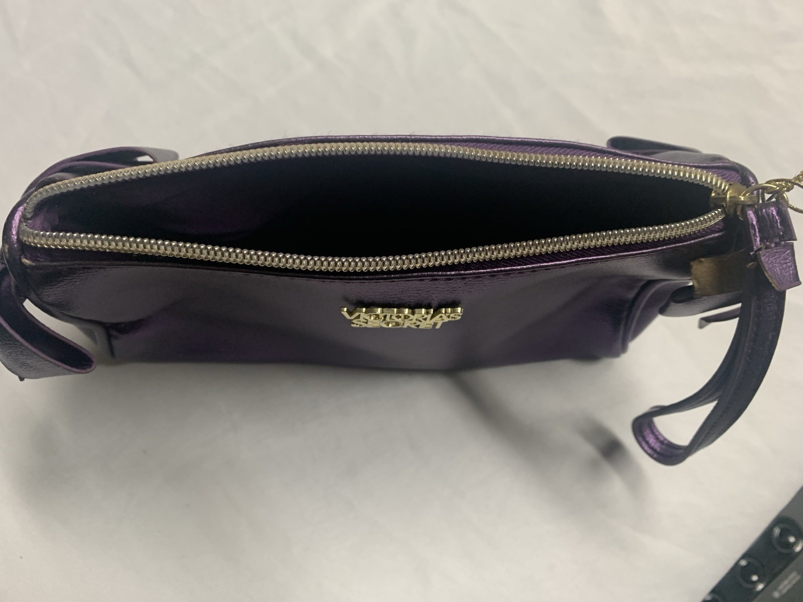 The Vintage Victoria's Secret Purple Makeup Bag is a stylish and compact accessory perfect for various occasions. This rectangular shaped bag features a zip closure and a wrist strap handle in a matching purple color. Made of faux leather with a metallic finish, it has gold-plated hardware accents and a bow detail, adding a touch of elegance. The lightweight design and small size make it convenient for travel, weddings, parties, and everyday use. The interior is lined with a purple polyester material, providing a comfortable and organized space for storing makeup and essentials.