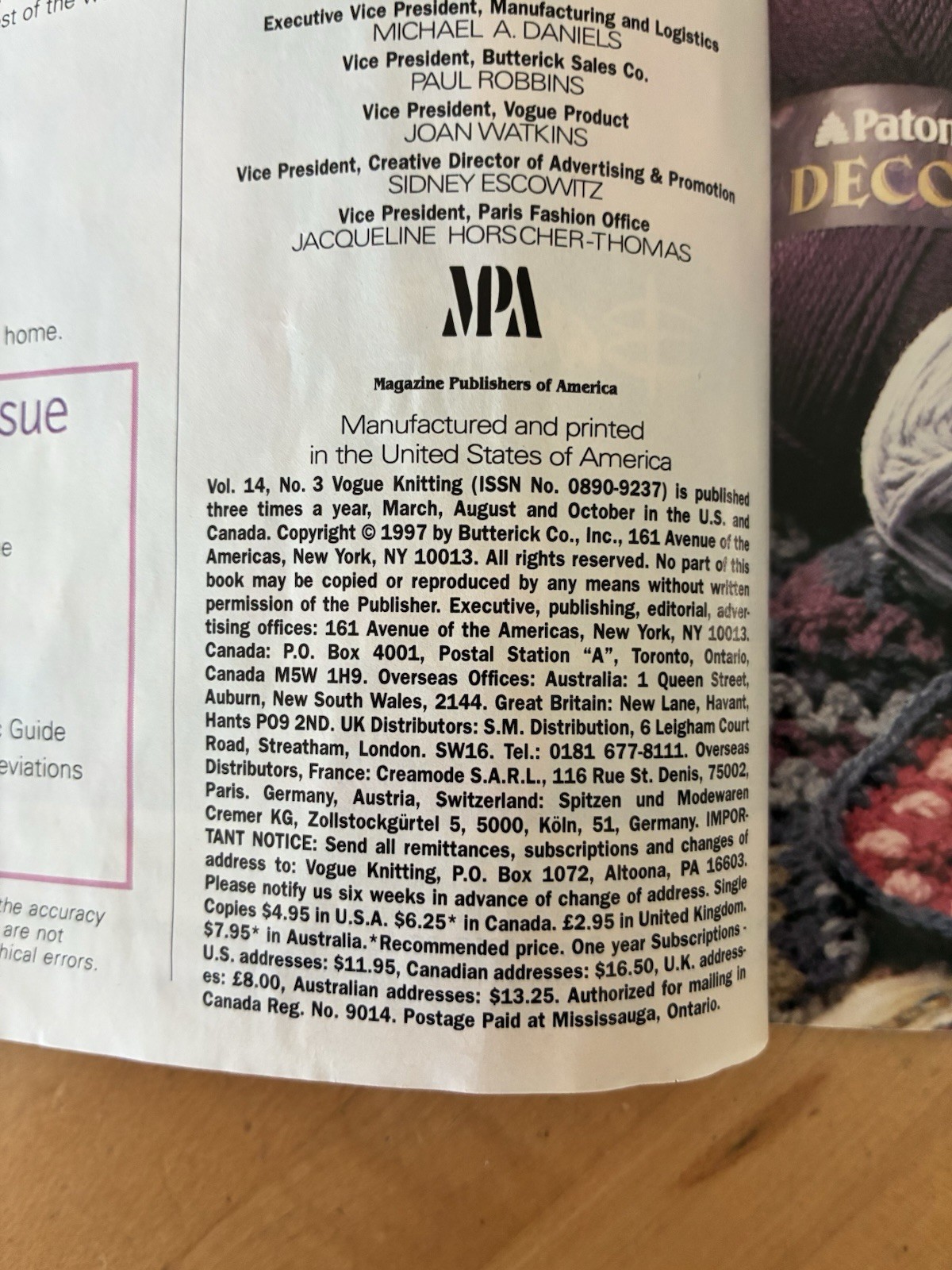 Vintage Vogue Knitting International Magazine Spring/Summer 1997. Condition is pre-owned. Smoke free, pet free home. Shipped via USPS Media Mail. In good condition. There is water damage to the bottom of the magazine and there is a small tear in the bottom of the front cover. Pages are free of markings, creases or rips.