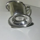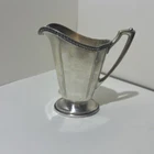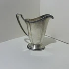 This vintage Wallace silver plate creamer pitcher is a must-have for any collector of American Empire style or British-themed tableware. The piece features intricate details and a beautiful design that is sure to impress your guests. It is an original, licensed reproduction and has been well-maintained over the years, making it a valuable addition to your collection. The creamer pitcher measuring 5” tall, is perfect for serving cream or milk holding about 6oz and is part of the Hotel Silver product line. It is made of high-quality material and is in good condition, ready to be displayed or used for its intended purpose. Don't miss out on the opportunity to own this stunning piece of history.