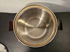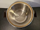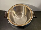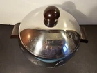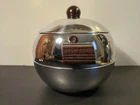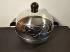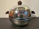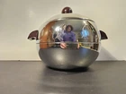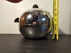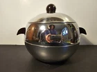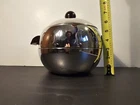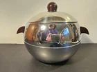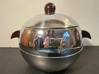 This vintage West Bend aluminum ice bucket is a must-have for any mid-century modernism barware collector. With a round shape and chrome material, it is perfect for all occasions and can hold up to 2 quarts of ice. The ice bucket features BakeLite handles and is insulated, making it a great addition.