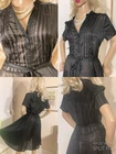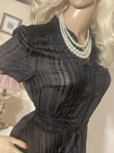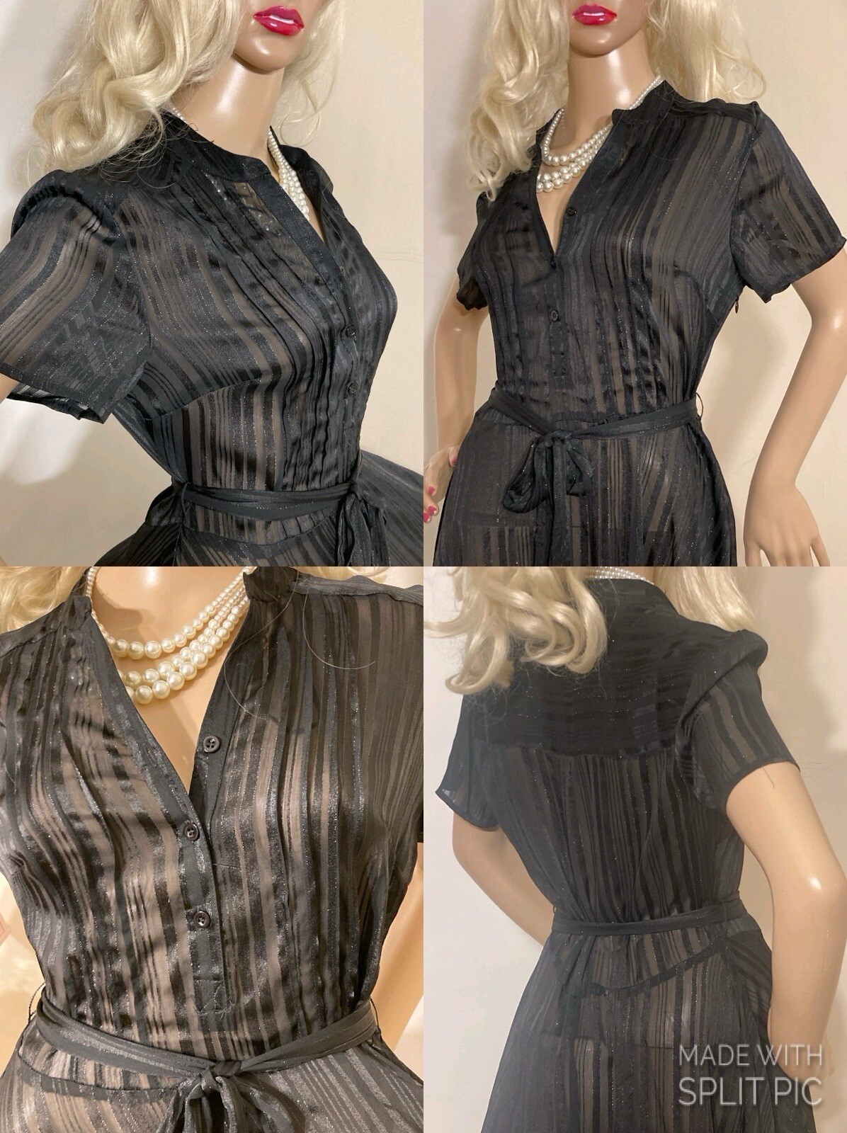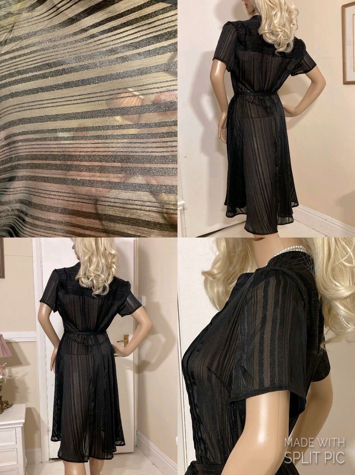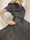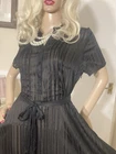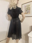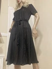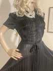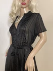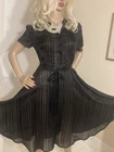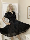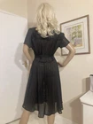 VINTAGE STYLE western Prairie BOHO SWING Dress COMPLETELY SHEER Polyester Chiffon MATTE & SHINY BLACK in Sheer & Glossy Stripes with an accent Silver thread throughout FIT & FLARE DRESS Round Grandad style Collar with Placket stitched Button Front & Darted Bust Short sleeved FLARE SWING SKIRT in Chevrons has 160” Sweep Contrasting tie belt Add any colour slip & instant new look UNBRANDED ~* MEASURES*~ Shoulders 16” Bust 36”-38” From shoulder to waist 16” Waist 32” can be cinched with belt Hips 62” Total length 30” Sleeves 2” from under arm STUNNING ON In VERY GOOD Pre Loved Vintage Condition NO LABELS HANGS DIVINELY Please view my other auctions Thank you