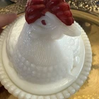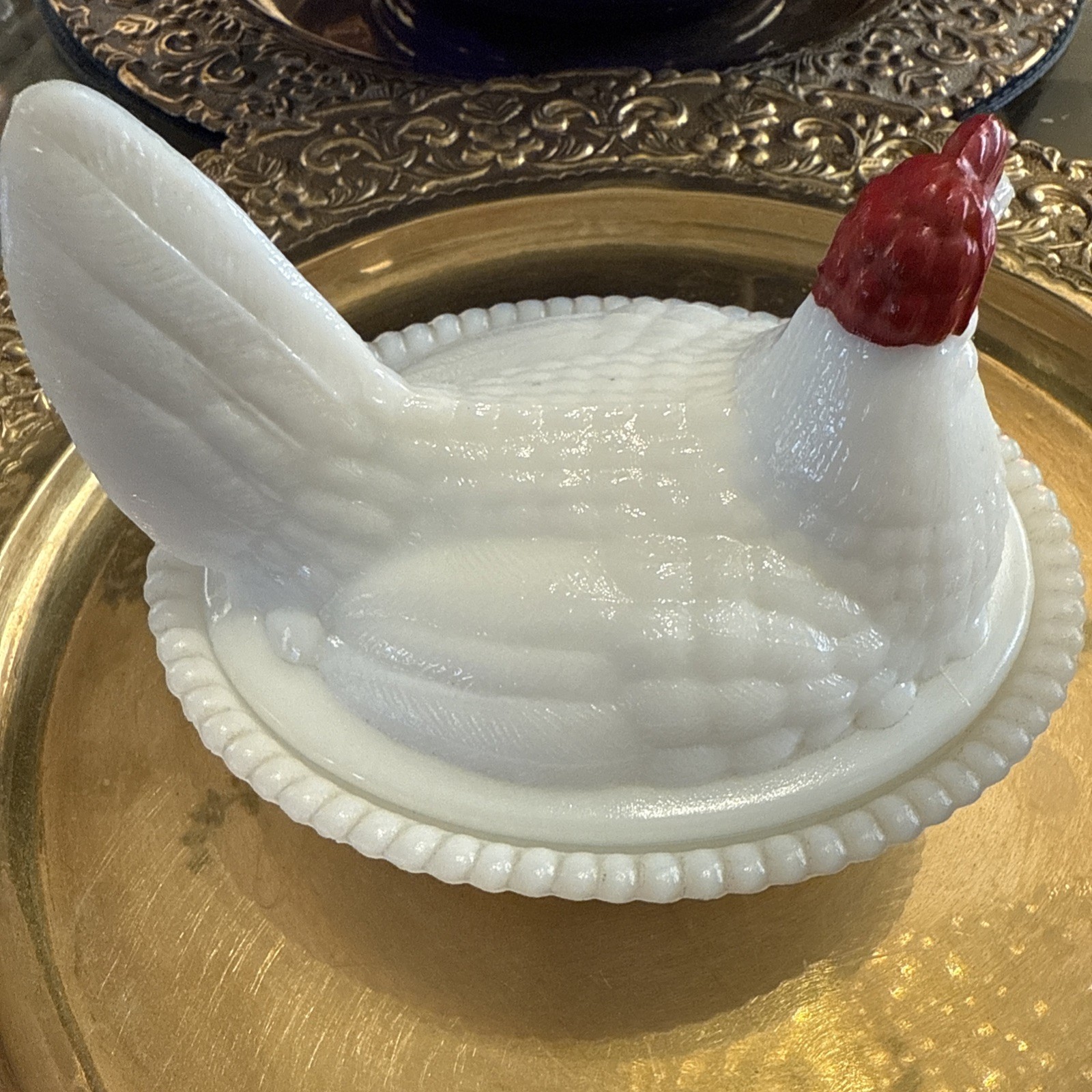 The Westmoreland 5.5 Milk Glass Chicken Rooster Hen on Nest Covered Candy Dish is a vintage original piece from the Westmoreland brand. This unique candy dish features a chicken shape design, made of milk glass with a glossy white finish. With its elegant style and one compartment, it is a charming addition to any collection or home decor. It is recommended to hand wash only to preserve its vintage appeal. This unboxed candy dish is a true MCM classic that exudes a timeless charm with its milk glass production style.