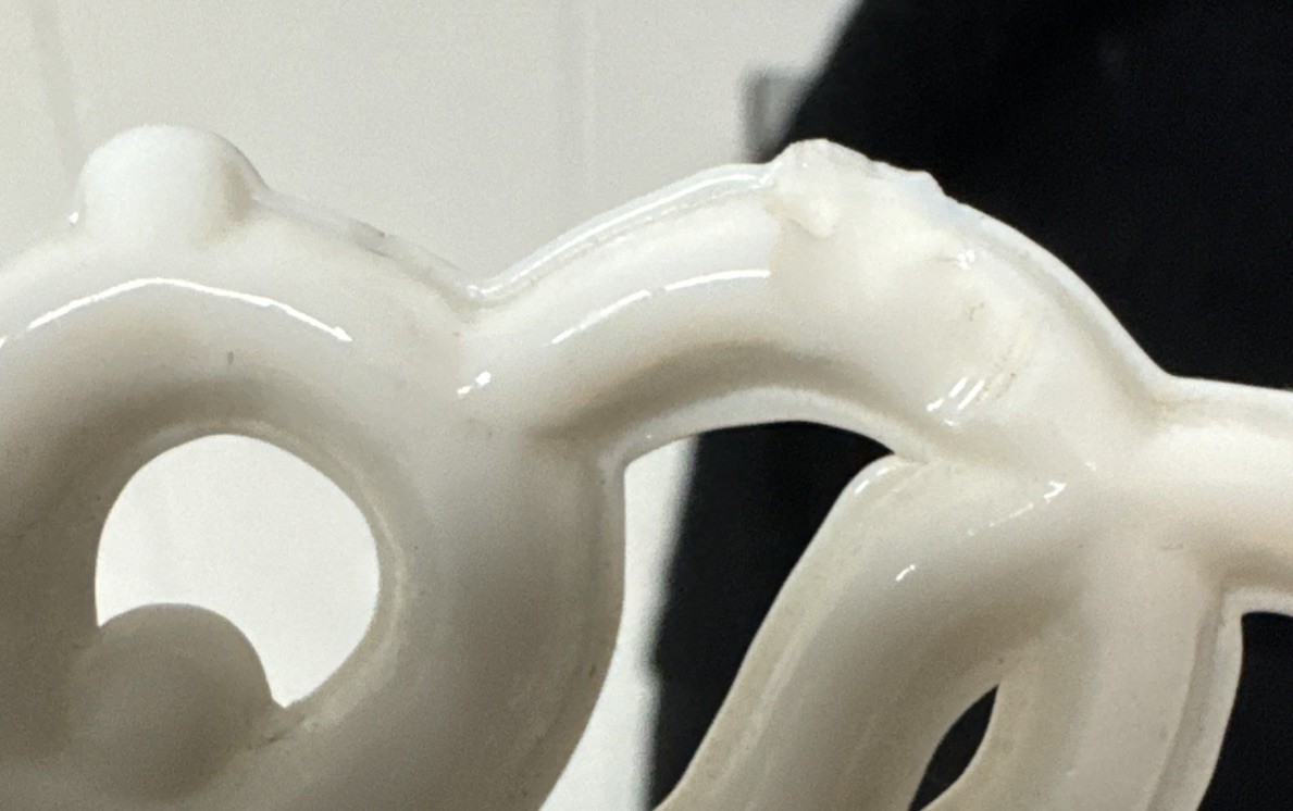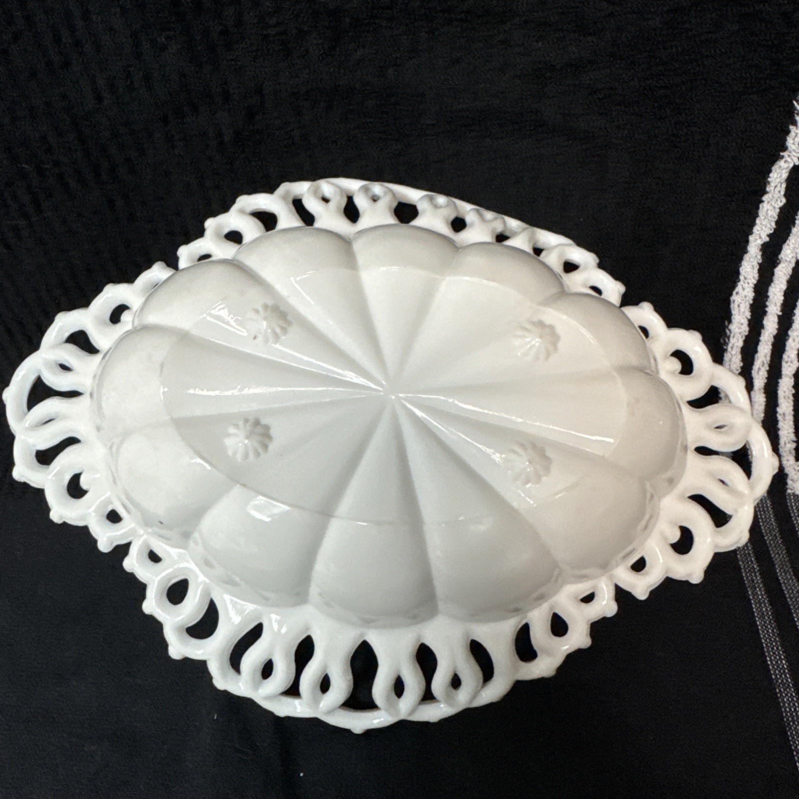 This vintage Westmoreland milk glass bowl is a beautiful addition to any collection. The lattice pattern is intricate and eye-catching, making it a perfect display piece for any room. Measuring at 9 1/2 inches, it's the perfect size for serving guests or for using in the kitchen. Crafted with high-quality glass, this bowl is sure to last for years to come. Note: two small blemishes on bottom and a small chip on lattice. See last two photo for details.