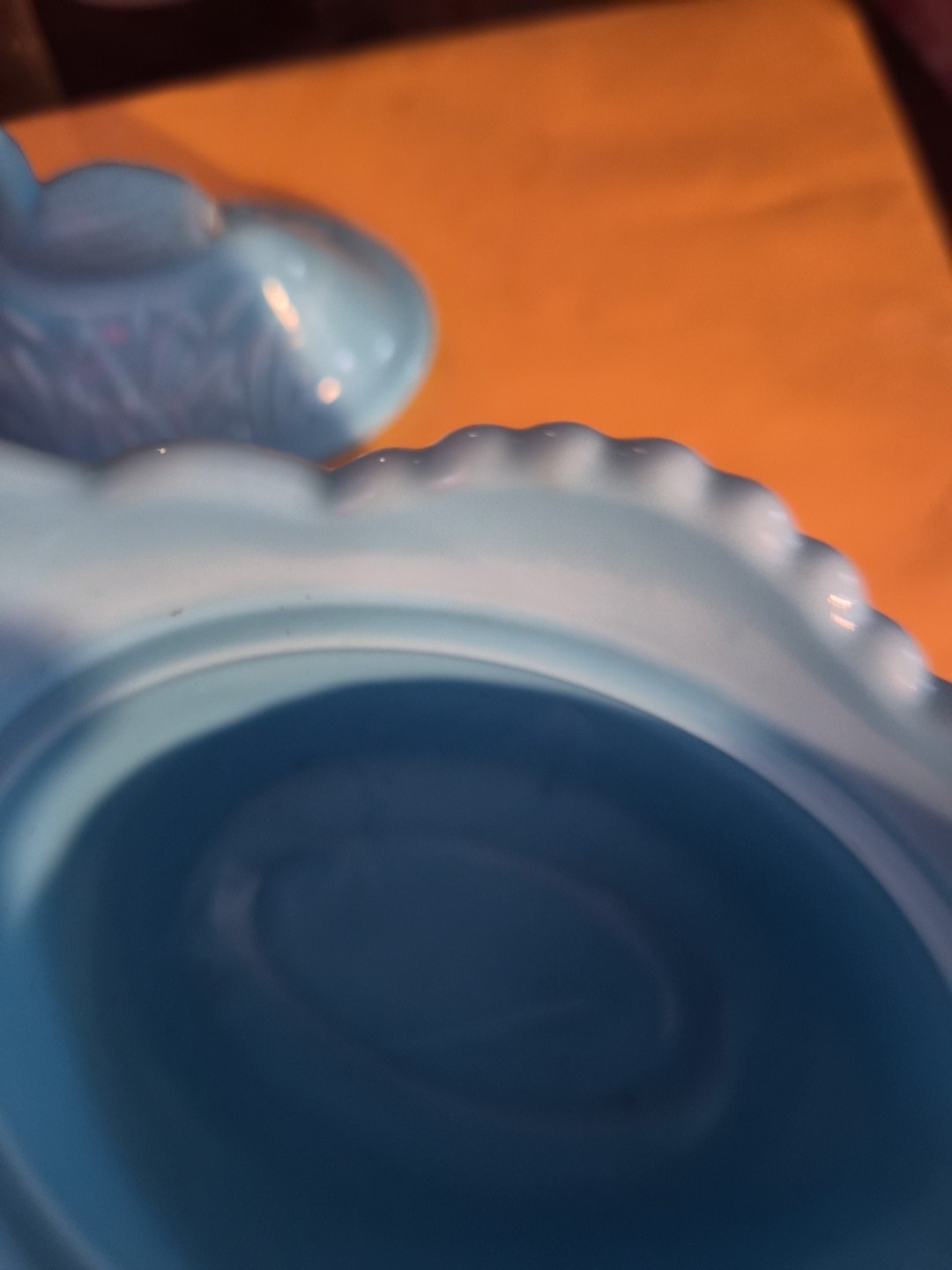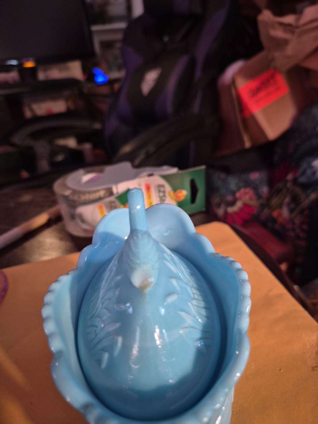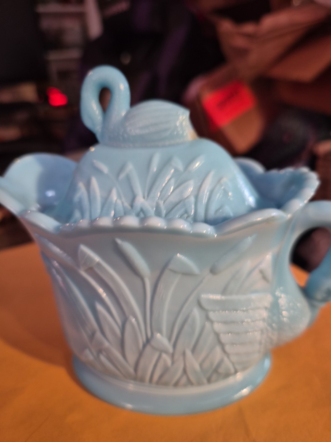 This vintage Westmoreland blue milk glass swan cattail design lidded creamer is a charming and decorative piece for any kitchen or dining room. Made of high-quality glass, the creamer features a beautiful swan and cattail design on the lid, adding a touch of elegance to your serveware collection. Perfect for serving cream or milk at the table, this Westmoreland creamer is a unique and collectible item that is bound to be a conversation starter.