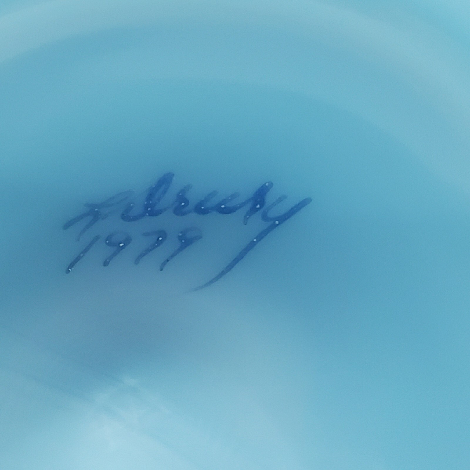 This elegant Westmoreland milk glass covered compote or candy dish, is hand painted with delicate white daisies. It is signed by the artist, R (or L) Drury, 1979. The interior of the lid is also signed. The height is 8" to the top of the finial, the bowl diameter is 3 3/8" and the foot is 3 1/8". The condition is good, no issues that I can find.