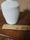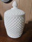 Preowned:No Chips or Cracks This vintage jam jar from Westmoreland is a beautiful addition to any farmhouse-themed kitchen. The white milk glass features an English Hobnail pattern and a glossy finish. The jar comes with a lid and a handle, making it easy to use and store. The small size, 3" in diameter and 5.25" in height, is perfect for storing jam or honey. The set includes two items, both made in the USA. This vintage piece is perfect for collectors or anyone who appreciates the charm of old-fashioned kitchenware.