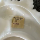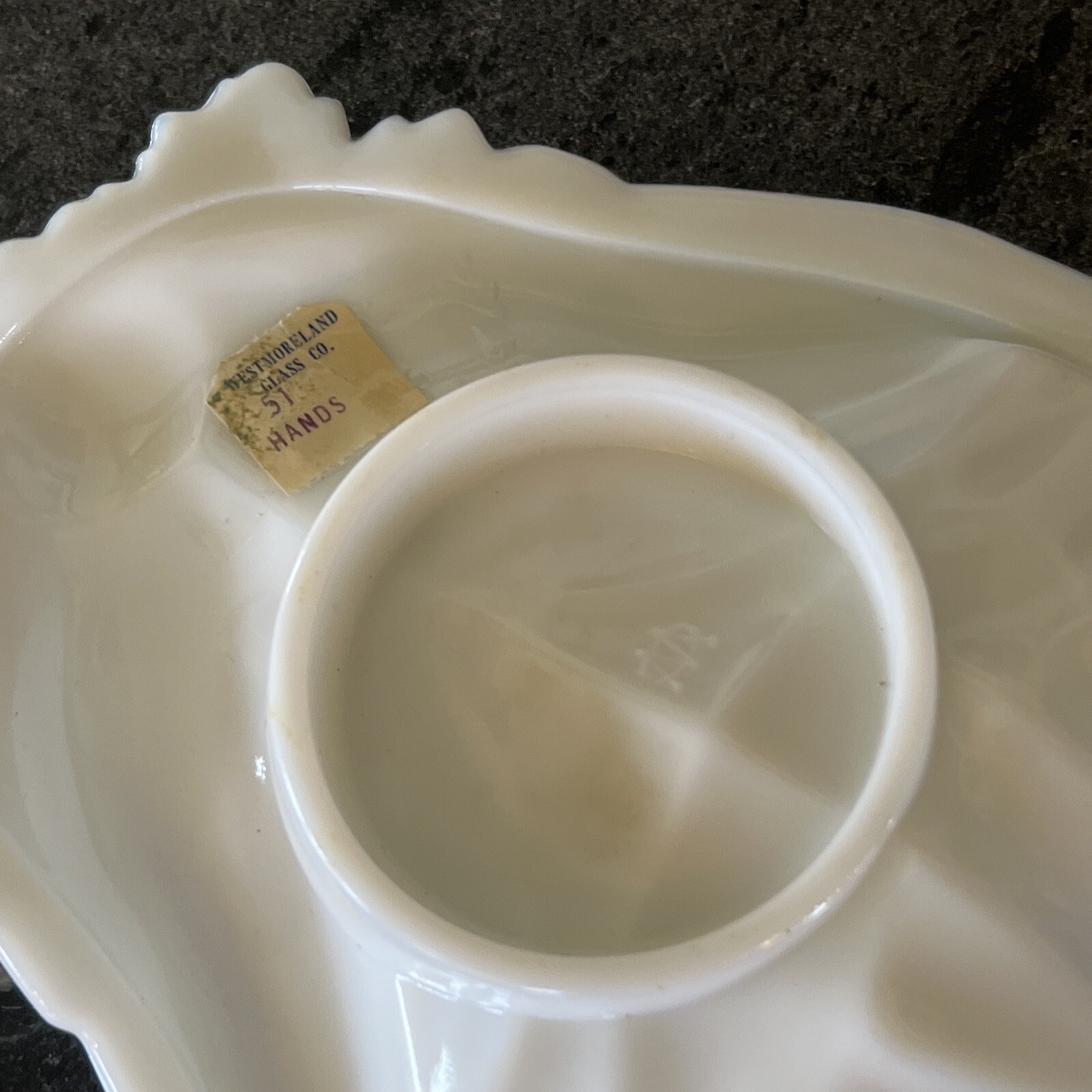 This vintage milk glass dish is a unique addition to any collection. With a figural design of open hands, it can be used as a soap dish, trinket holder, or jewelry dish. The white glass is accented by an impressed backstamp and was produced in the USA by Westmoreland. The candy dish is perfect for display or everyday use and would make a great gift for any collector. Excellent preowned condition. Actually still has the original West Moreland price tag on the underside.